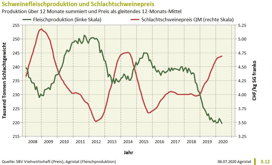 Dass die guten Schweinepreise nicht mehr lange unverändert bleiben, zeichnete sich schon länger ab. Denn auffällig war die um 0,8 Prozent steigende Schweinefleischproduktion in den ersten drei Quartalen 2020. Mit den um 20 Rappen tieferen Preisen wird nach einer Zeitspanne mit guten Preisen für die Schweinehalter eine Trendwende eingeläutet. Auf dem Schweinemarkt reagiert der Produzentenpreis blitzschnell und unmittelbar auf eine steigende oder sinkende Produktion. Die Wellen, welche in der Produktion und in den Preisen sichtbar sind, sind in der Marktwirtschaft als der «Schweinezyklus» bekannt.