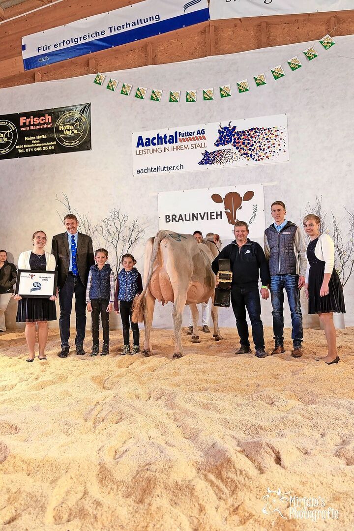 Unter Jubelrufen im Saal kürte Andreas Walser die Grand Champion. Der Titel ging an Dixi von Beat Lenzlinger aus dem thurgauischen Au. Sie war die Siegerin der Abteilung 7 – Kühe in der zweiten und dritten Laktation. Walser lobte Dixi als eindrückliche Kuh, stark im Rahmen, extrem schön gebaut, mit einem langen und breiten Becken sowie einem hoch angesetzten, breiten Euter mit einem starken Zentralband.