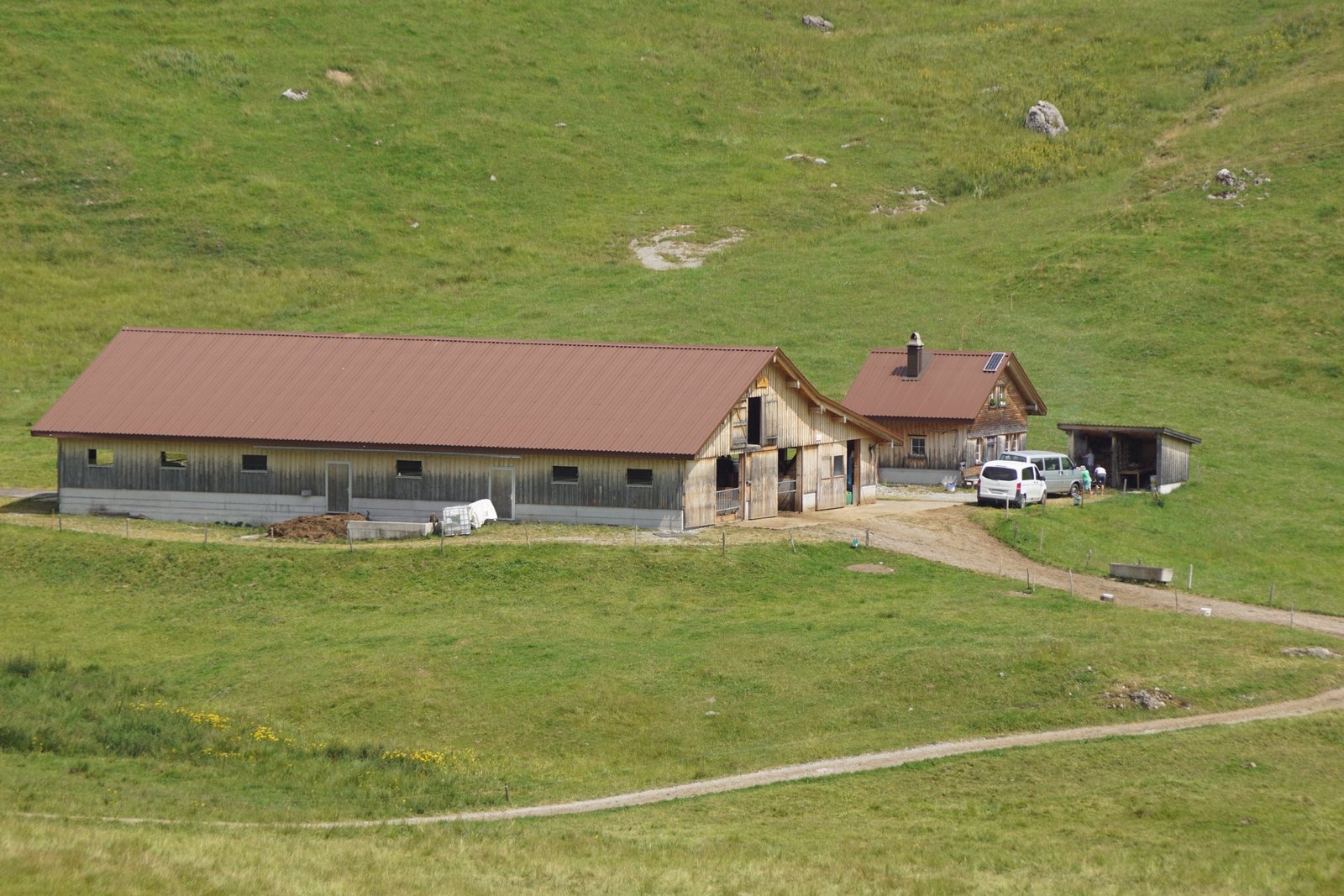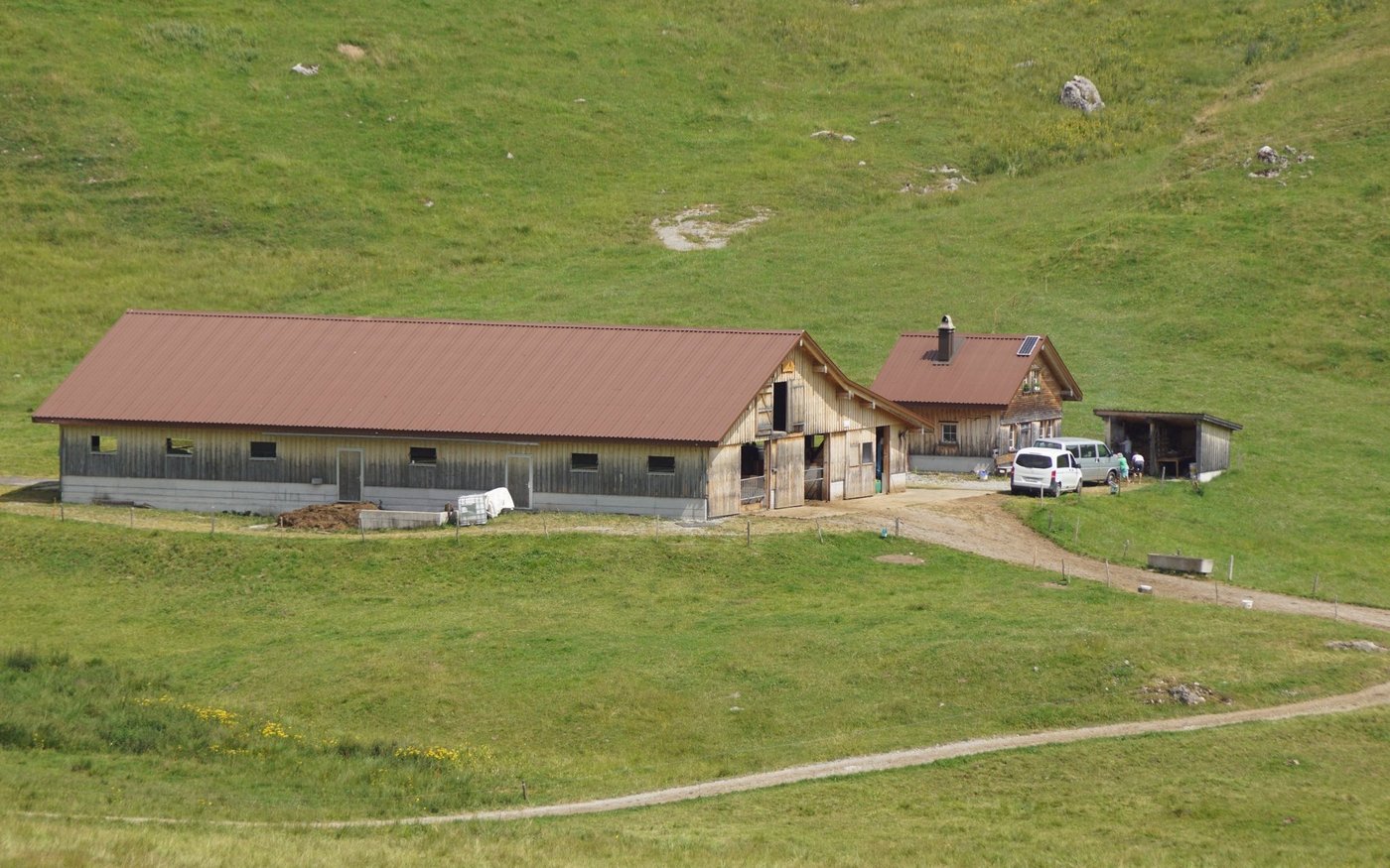 Sie melken die Kühe und fahren gegen sieben Uhr die Milch im Tank zur Sammelstelle in Wildhaus. Dann frühstücken sie in ihrem Haus im Talbetrieb. Gegen neun Uhr fahren sie wieder zurück auf die Alp. Der Rietstall, der Laufstall der Alp Hintergräppelen, wurde in den Jahren 2012 und 2013 als Ersatz des alten Anbindestalls erbaut. «Die Arbeit sollte einfacher werden», begründet Beni Wenk den Bau eines Laufstalles. Den 32 Kühen stehen Liegeboxen zur Verfügung und die 20 Rinder, 30 Kälber sowie 7 Ziegen können auf Tiefstreu, einer mit viel Stroh eingestreuten Fläche, liegen.