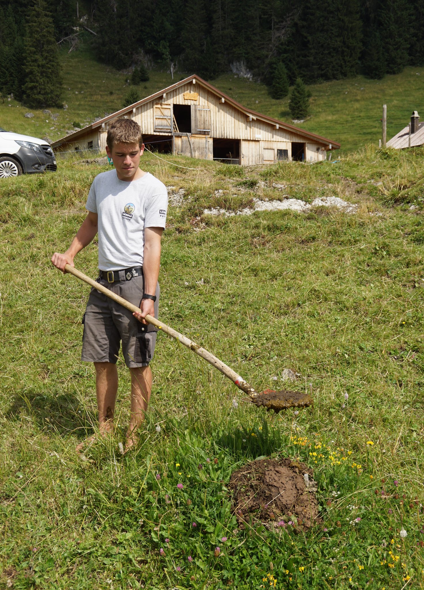 Wenn die Stallarbeit erledigt ist, wartet die Arbeit auf den Weiden. Zusammen mit seiner Grossmutter schichtet der älteste Sohn Damian mit der Schaufel die Kuhfladen auf der Weide zu Haufen auf. Er nennt das «den Boden schoren». Dies ist eine auf Appenzeller und Toggenburger Alpweiden übliche Weidepflege. So wird das Gras wieder sauber und die Kühe haben mehr Futter zur Verfügung. Die Geilstellen, wo Kot liegt, meiden sie. Nach dem Alpabzug im Herbst verteilen die Älpler die Kuhfladenhaufen dann wieder auf der Wiese, um diese zu düngen. Nach dem Mittagessen ruhen sich die Älpler aus, um danach den Unkräutern auf der Weide zu Leibe zu rücken. Vor allem die Blacken, die sich gerne an den nährstoffreichen Stellen ansiedeln, wo die Kühe Kot und Harn absetzen, gilt es in Schach zu halten.