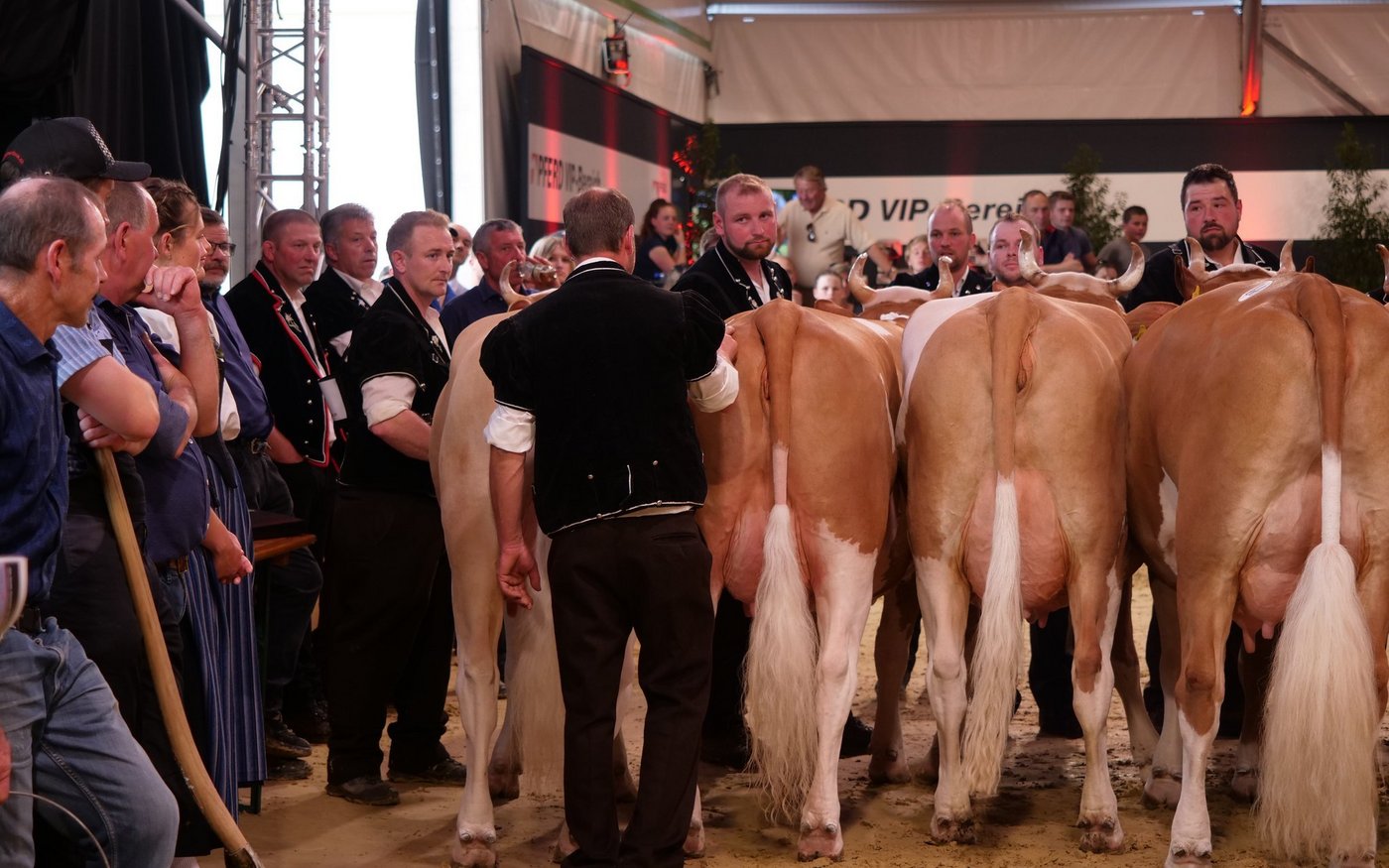 In den anschliessenden Miss- und Schöneuter-Wahlen wählten die Richter von jeder Rasse vier Tiere für die engere Wahl aus. Bei den Simmentalern durften Aladin Heidi von Ueli Schärz aus Aeschi b. Spiez, Stalden Brisago Volta von Peter Brügger aus Frutigen, Fantast Elodie von Familie Schmied aus Guggisberg und Amur Meieli von Andreas Steiner aus Ried im Ring bleiben.