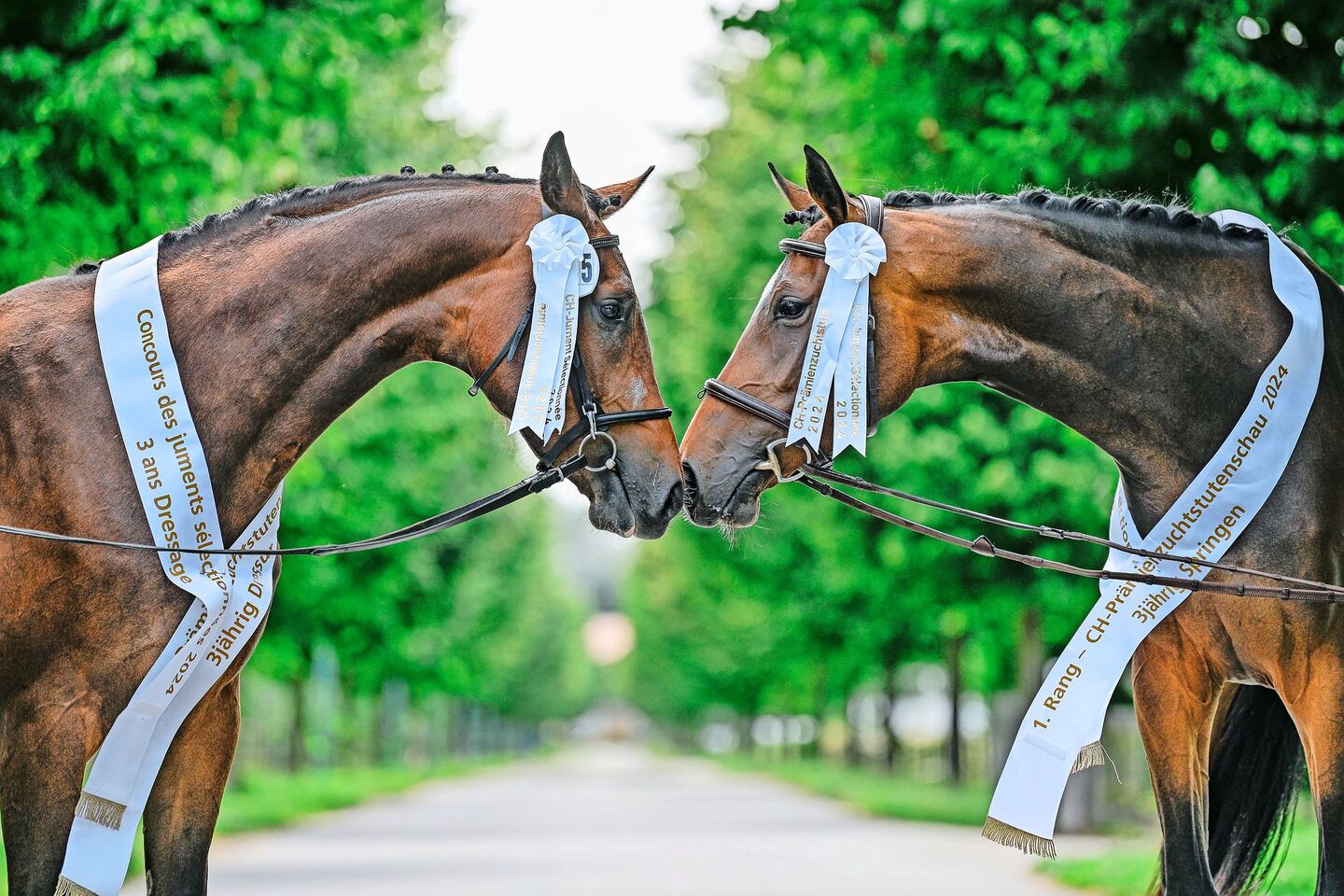 Insgesamt 35 der dreijährigen Stuten wurden mit dem Titel «Prämienzuchtstute» ausgezeichnet. Siegerin bei den springbetonten Stuten und neue Miss Schweiz 2024 wurde Diva Deluxe CH (Diacontinus - For Edition - Grand Cru) des Züchters und Besitzers Theo Banz. Als beste dressurgezogene Stute gewann Darleen sz CH (Sweet Hero - De Niro - Don Gregory) aus der Zucht von Christoph Suter, in Besitz von Elisabeth Rademaker.