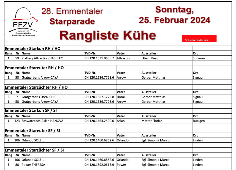 Caya zusammen mit ihrer Stallkollegin Gratgerbers Doral Chic, liessen dann auch beim Züchtercup keine Zweifel aufkommen und holten den Titel des Starzüchters der Holstein in Gratgerbers Stall. Bei den Rassen SI und SF, die Mario Nydegger richtete, ging der Starzüchtertitel an Marco und Simon Egli aus Linden, die mit den Kühen Orlando Soleil und Power Theresa die Nase in Sachen Harmonie vorne hatten. Orlando Soleil hatte sich zuvor bereits den Stareutertitel gesichert.