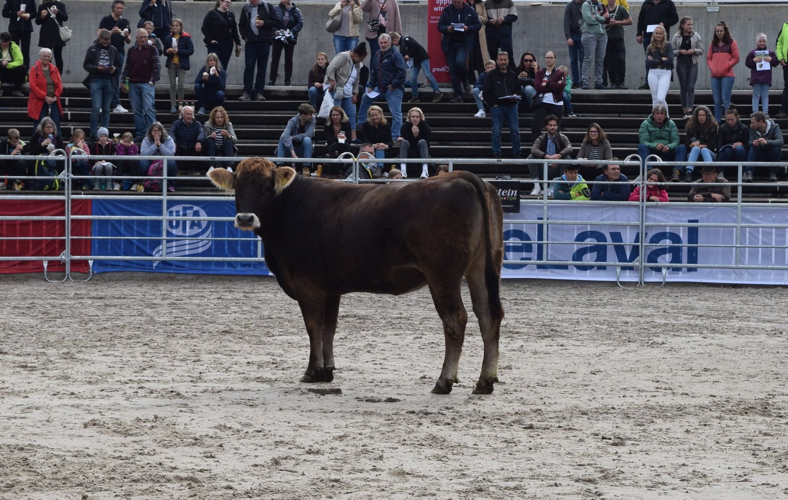 Als drittes Tier wurde OB-Kuh Azura mit ihrem Kalb in den Ring gebracht. Das Stierenkälbchen war etwas übermütig, rannte kreuz und quer durch den Ring und bahnte sich schliesslich einen Weg zwischen der Kamera und Pannels hindurch, wodurch das Stromkabel riss. «Das war’s dann mit der Live-Übertragung», kommentierte Jaquement trocken. Azura wurde nach kurzer Unterbrechung für 4'500 Franken versteigert und erzielte damit das Tageshöchstgebot. [IMG 7]