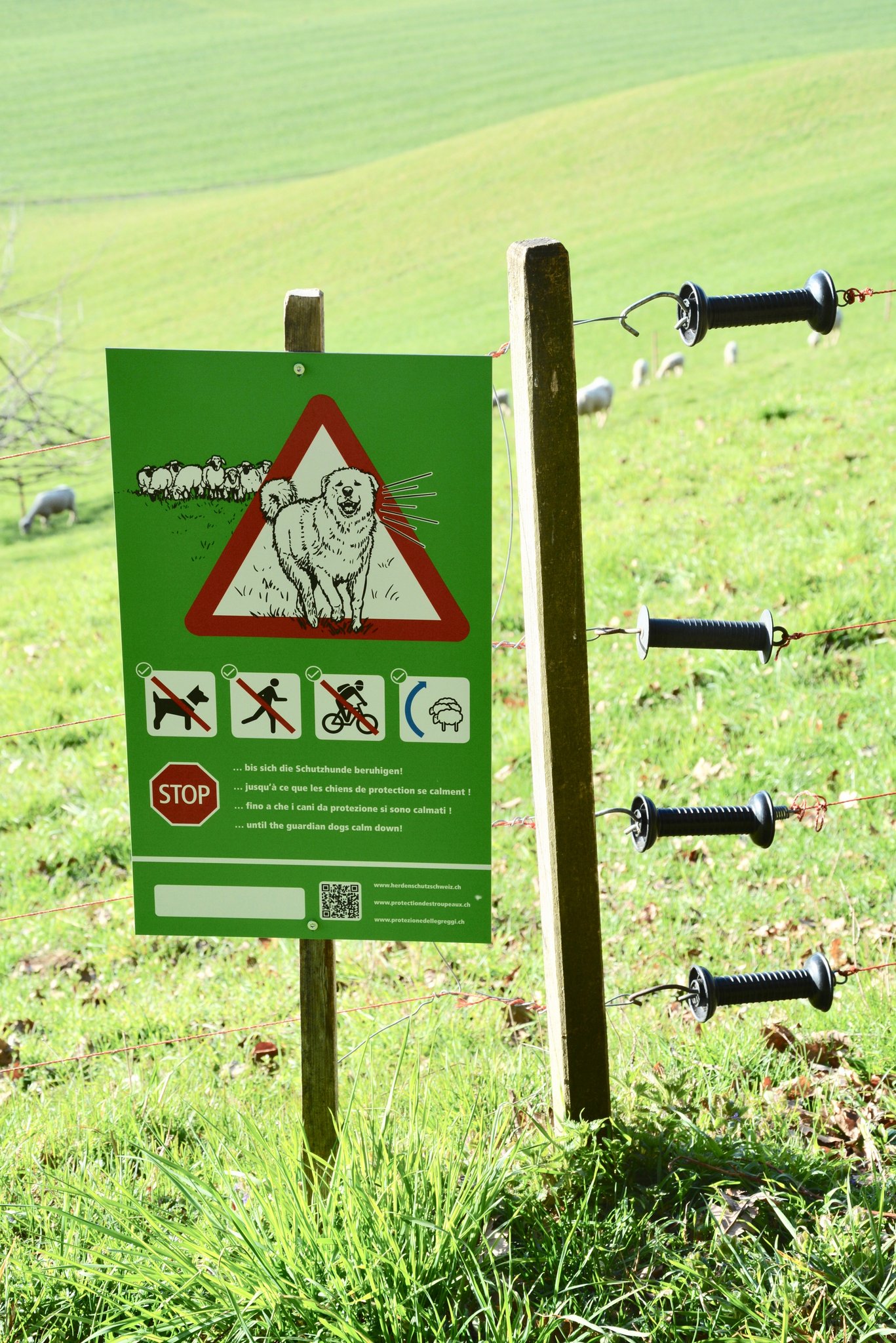 Noch bevor man hört oder sieht, dass Herdenschutzhunde auf dem Betrieb von Sabrina Otto und Bruno Zähner gehalten werden, fallen die grünen Tafeln auf. Sie sind auf dem ganzen Areal des Guggenbühls, das auf einer Anhöhe etwas ausserhalb des zürcherischen Illnaus liegt, verteilt. Auf ihnen findet man die offiziellen Warnhinweise und Verhaltenstipps vom Bundesamt für Umwelt für den Umgang mit Herdenschutzhunden. Betr…