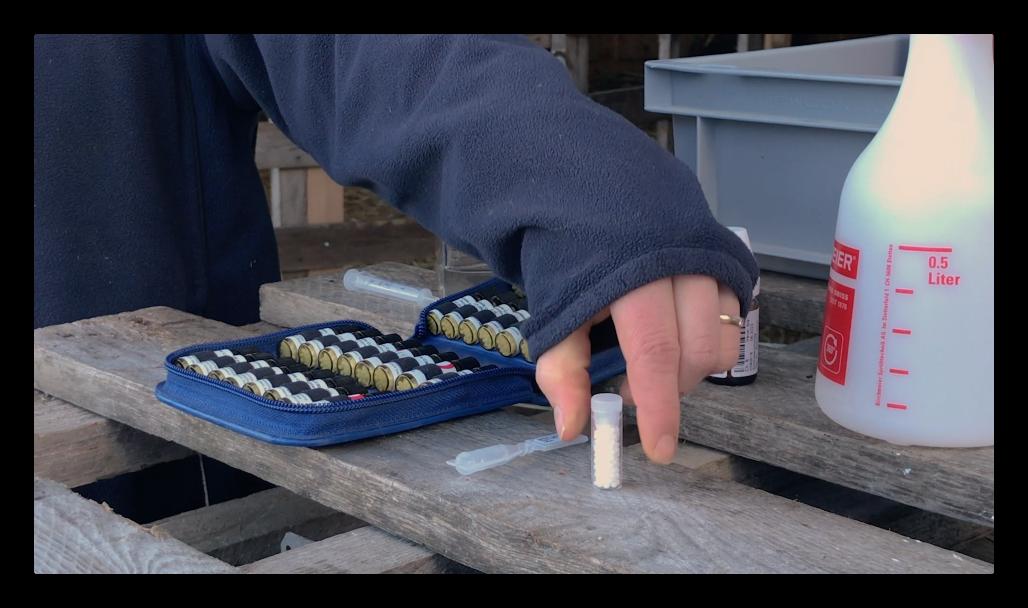 Nicht in jedem Fall lassen sich die Globuli so einfach verabreichen wie bei der zahmen Trixi. Eine weitere Möglichkeit ist es, sie in Wasser aufzulösen und als sogenannten «Split» zu verabreichen. Dazu füllt man frisches Wasser in eine Sprühflasche, gibt die erforderlichen Globuli dazu und schüttelt anschliessend die Flasche. Nun kann man das Arzneimittel auf die Nase zielen, was auch funktioniert, wenn sich das Tier etwas weiter weg befindet. Mit der Split-Methode kann man auch scheue Tiere behandeln oder sogar eine ganze Herde. Karoline Schweingruber führt dies an ihren Mutterkühen vor, indem sie vom Zaun des Auslaufstalls die Nasen einiger Tiere besprüht.