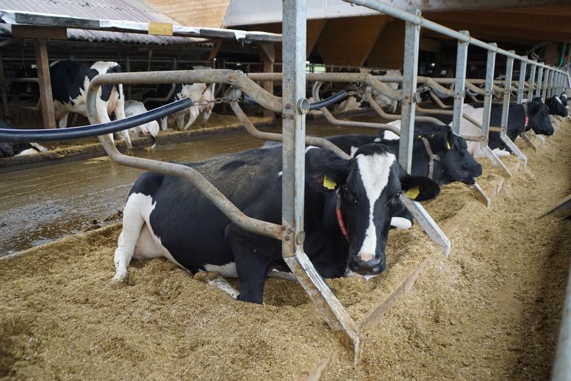 Es fällt auf, dass es im Stall sehr ruhig ist. Die Kühe müssen nicht vor einem belegten Melkroboter warten, sondern kommen gleich zum Melken. Offene Seitenwände und ein Lichtfirst gewährleisten ein gutes Stallklima. In den Liegeboxen liegen die Kühe auf einem weichen Strohbett. Obwohl die Kühe gross sind, haben sie genügend Platz und stossen beim Abliegen und Aufstehen nicht an die erhöhten Boxenbügel. Zum Einstreuen fährt eine Maschine einmal die Woche entlang der Liegeboxen. Die Kühe liegen besonders gerne in die Aussenboxen entlang der offenen Stallseite.