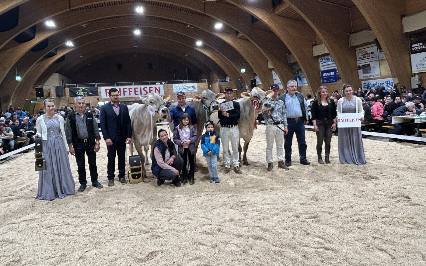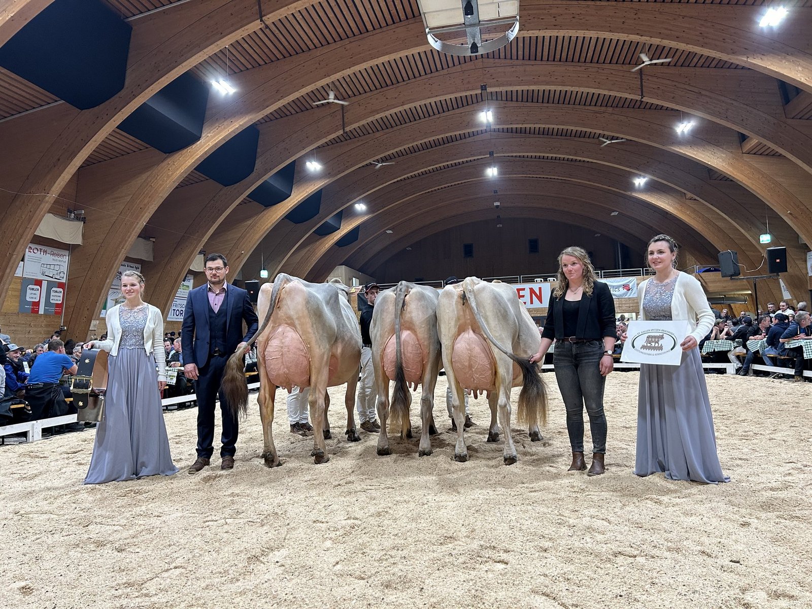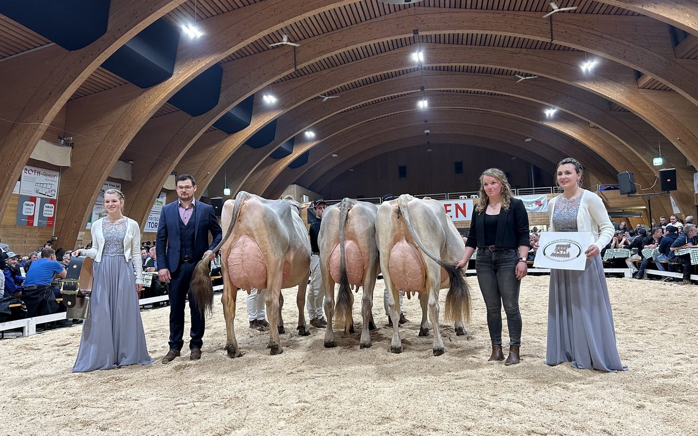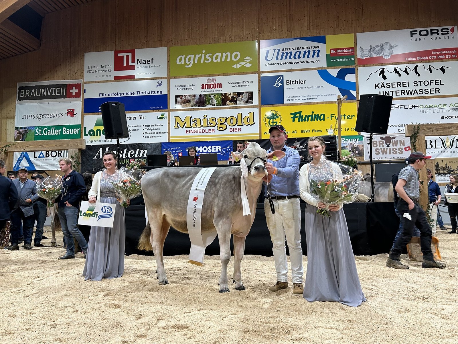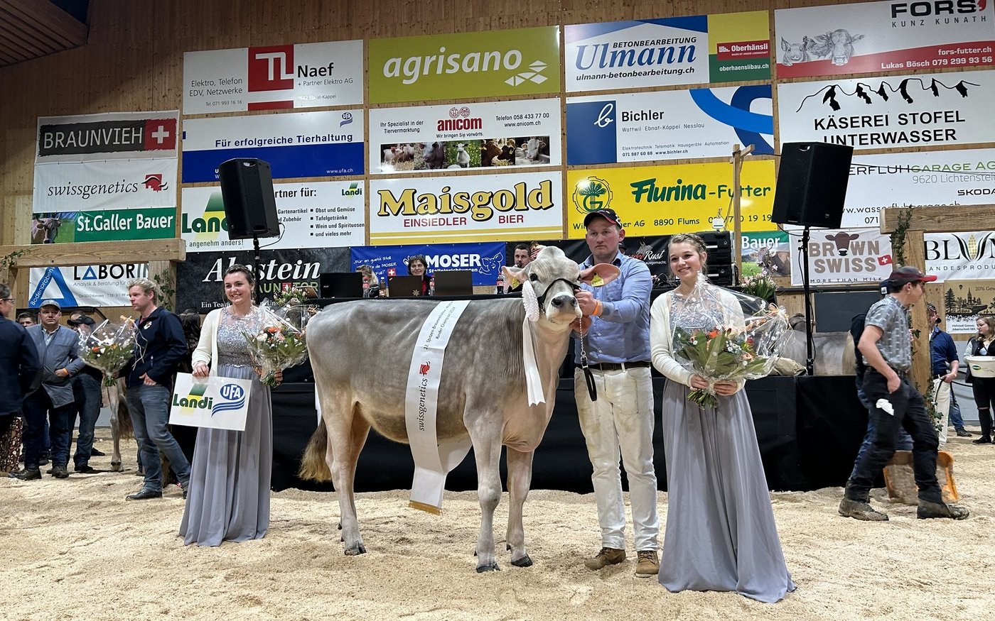 Die grosse Siegerin der 22. Spitzen-Braunvieh Show war Jamaica von Christian Schneider aus Schwendi. Die Holdrio Tochter in zweiter Laktation überzeugte insbesondere mit ihrer starken Euteraufhängung und ihrer Eleganz. «Ein athletisches Tier mit grosser Flankentiefe, schönem Fundament und einem wunderbaren Euter», brachte es Richter Andreas Valär aus Jenaz auf den Punkt. Ueli Tischhauser aus Oberschan eroberte mit seiner drittlaktierenden Canyon Urinka den Vize-Championtitel. Auf den dritten Rang stellte Richter Andreas Valär die Grischa Star Tochter Anschi von Andreas Wittenwiler aus Nesslau. Die letztjährige Champion Nischa kam dieses Mal nicht in die vorderen Ränge. [IMG 2] Die Championkuh Jamaica schaffte es auch beim Schöneuter-Wettbewerb der jüngeren Kühe auf das Podest und wurde Dritten. Sie musste der erstrangierten Phil Brina von Ueli Tischhauser und der Zweiten O Malley Emerita von Christian Beeler-Kurath aus Flumserberg den Vortritt lassen. Den Schöneuter-Wettbewerb bei den älteren Kühe gewann Lennox Wonja von Edwin Schirmer aus Goldingen. Die Vize Champion Urinka von Ueli Tischhauser schaffte es auch in der Schöneuterwahl auf den zweiten Platz, erneut gefolgt von Anschi von Andreas Wittenwiler.
