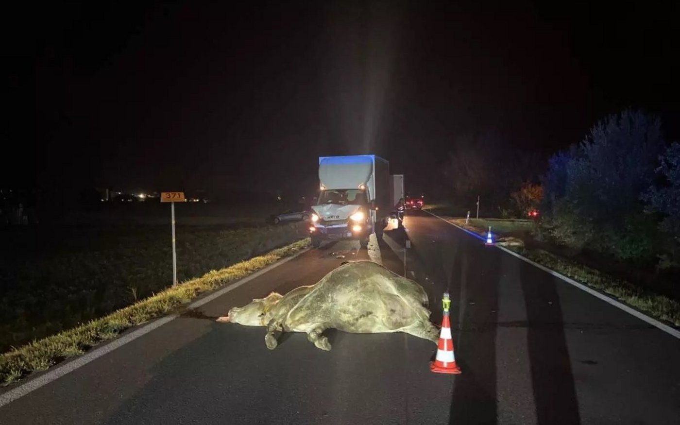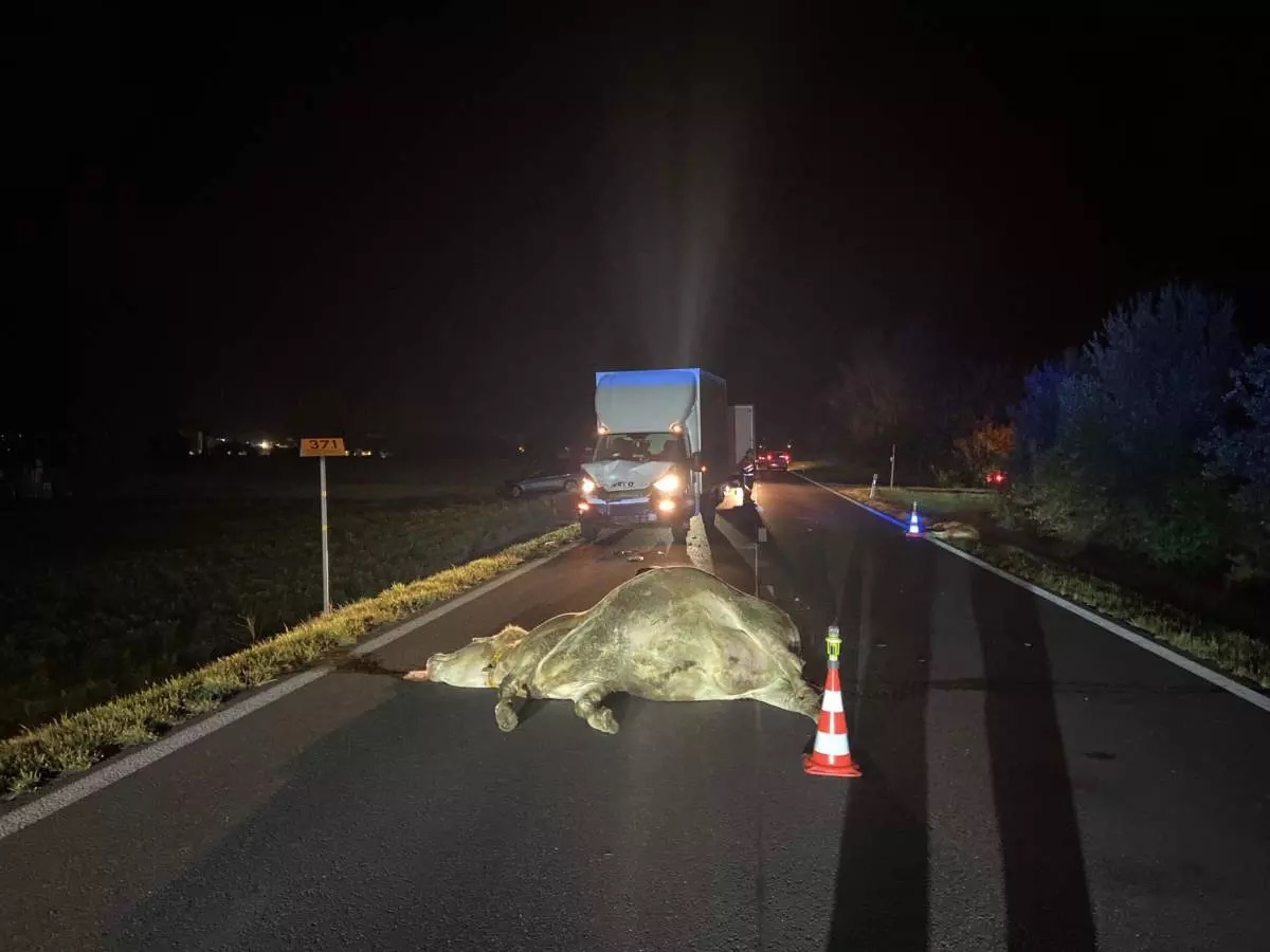 In der Folge kollidierte der Lastwagen mit einer Kuh und einem Kalb, die beide laut Kapo auf der Unfallstelle starben. Der Lenker sei unverletzt geblieben, das Fahrzeug wurde stark beschädigt