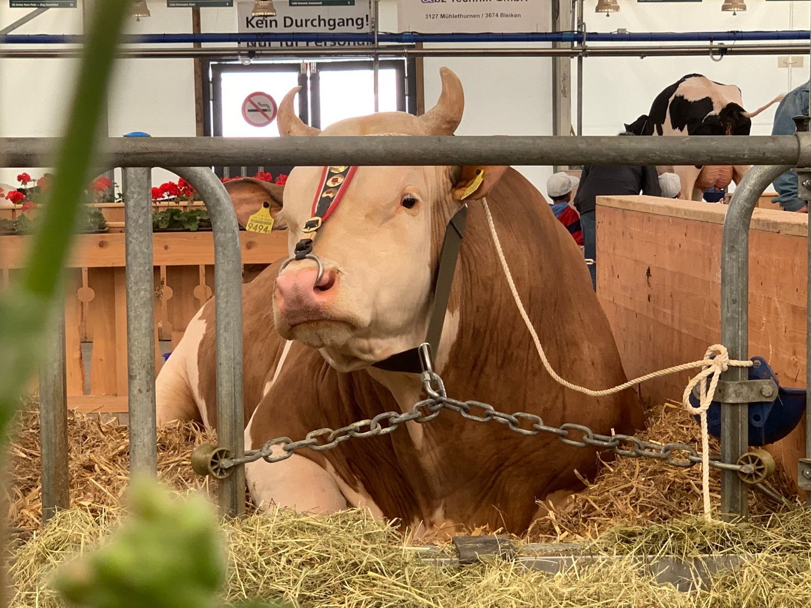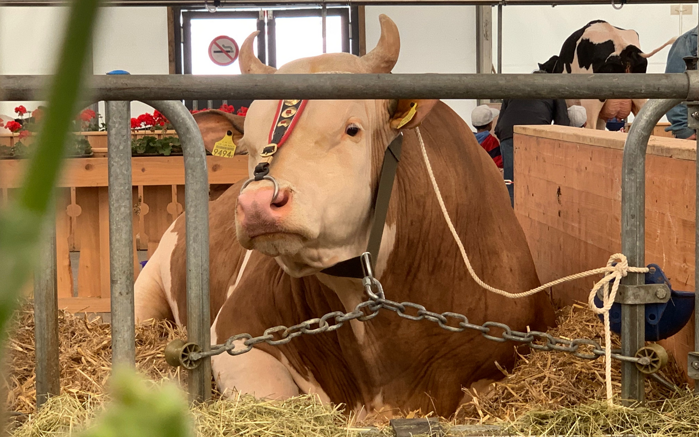 Santos ist mit seinen 1250 kg ein wahrer Koloss. An der diesjährigen BEA repräsentiert der Stier die Simmentaler Rasse und hat dazu für die nächsten Tage bestens sichtbar auf seinem Läger Platz genommen.