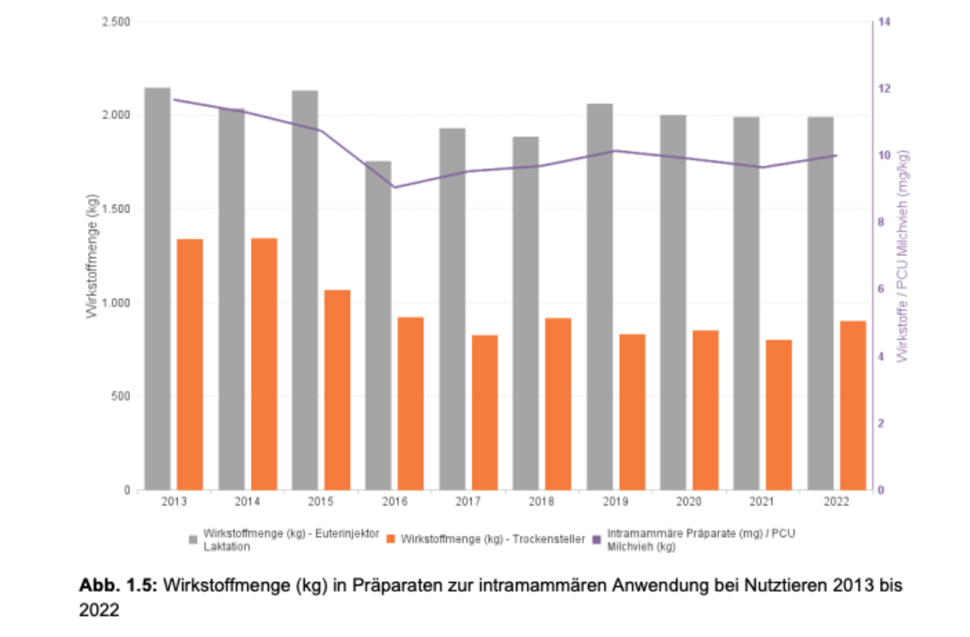 «Die verkaufte Wirkstoffmenge intramammärer Präparate bei Nutztieren ist in den vergangenen Jahren, nach einem Rückgang bis 2016, mit kleinen Schwankungen weitgehend stabil», schreibt das BLV. Ebenso seien die Wirkstoffmengen von Präparaten, die zur Behandlung bei laktierenden Kühen bestimmt sind, und die Wirkstoffmenge in Trockenstellern seitdem konstant.