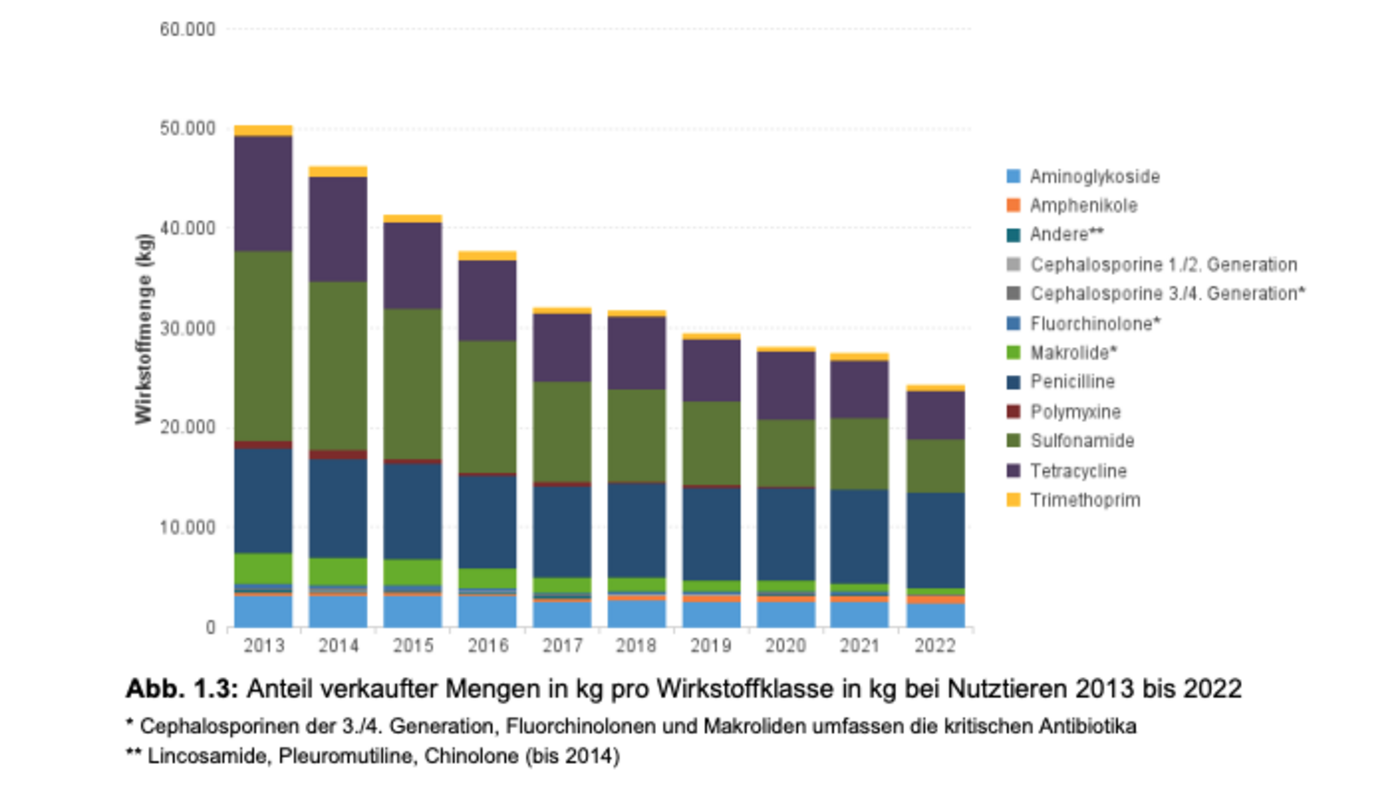 Das BLV stuft den Rückgang der Wirkstoffmenge bei kritischen Antibiotika als gross ein. Bezogen auf die Gesamtmenge von 3'709 kg im Jahr 2013 betrage der Rückgang 80% (2'977 kg); Makrolide minus 83%, Cephalosporine 3./4. Generation minus 71%, Fluorchinolone minus 64%. Seit 2016 nahm der Verbrauch kritischer Antibiotika um mehr als 2/3 ab. Von 2021 auf 2022 beträgt der Rückgang 40%.