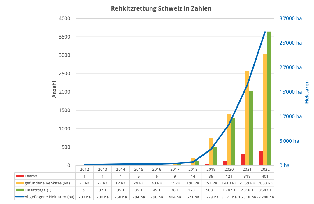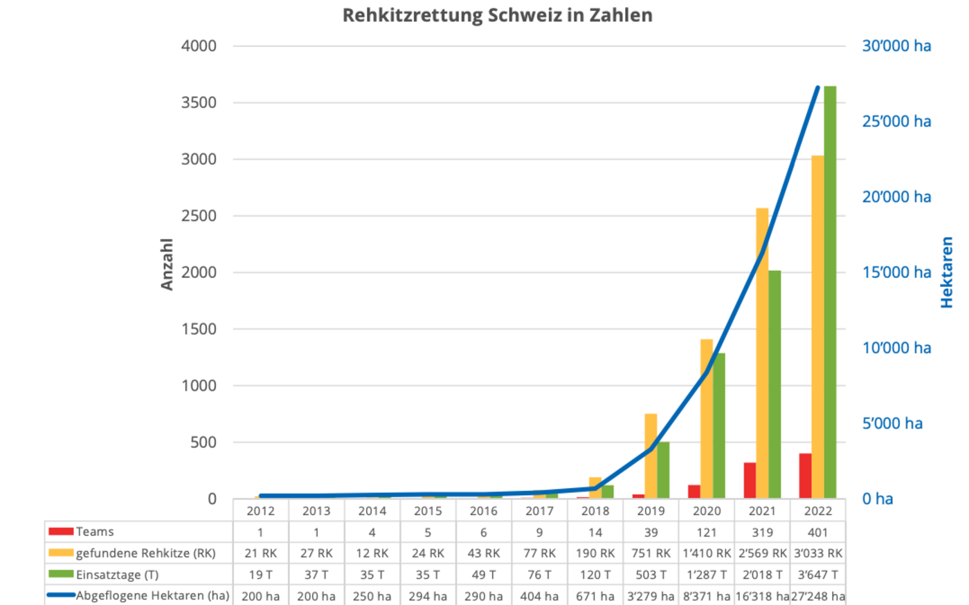 Die Hauptsaison für die Rehkitzrettung dauert von Ende April bis Anfang Juli und ist damit für dieses Jahr beendet. Die Bilanz des gemeinnützigen Vereins Rehkitzrettung Schweiz ist positiv – das starke Wachstum der Anzahl Einsatztage in den Vorjahren konnte fortgesetzt werden.