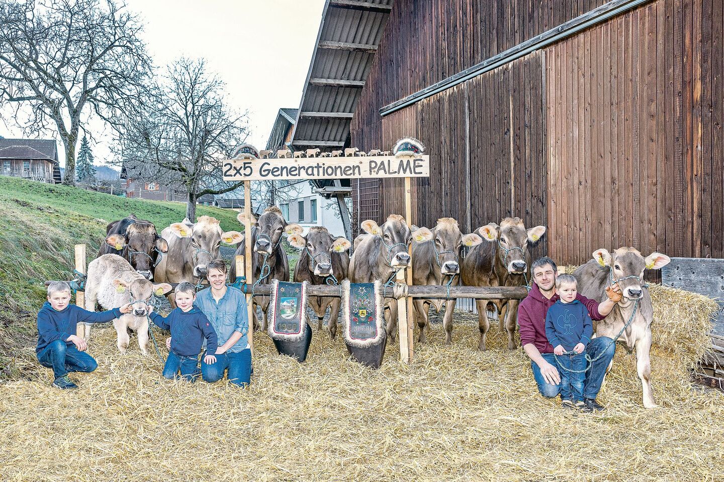 Auf dem Zuchtbetrieb der Familie Markus und Antonia von Ah-Spichtig, Flüeli-Ranft, stehen zweimal fünf Generationen von der Stammkuh Pilatus Palme. Die Stammkuh ist aktuell in ihrer 13. Laktation und hat im Dezember 2023 die Lebensleistung von 85 000 kg erreicht. Sie gebar bisher zwölf Kälber, wovon neun weibliche Tiere waren. Neunmal war der Prelude-Sohn Pauer Vater der Kälber.