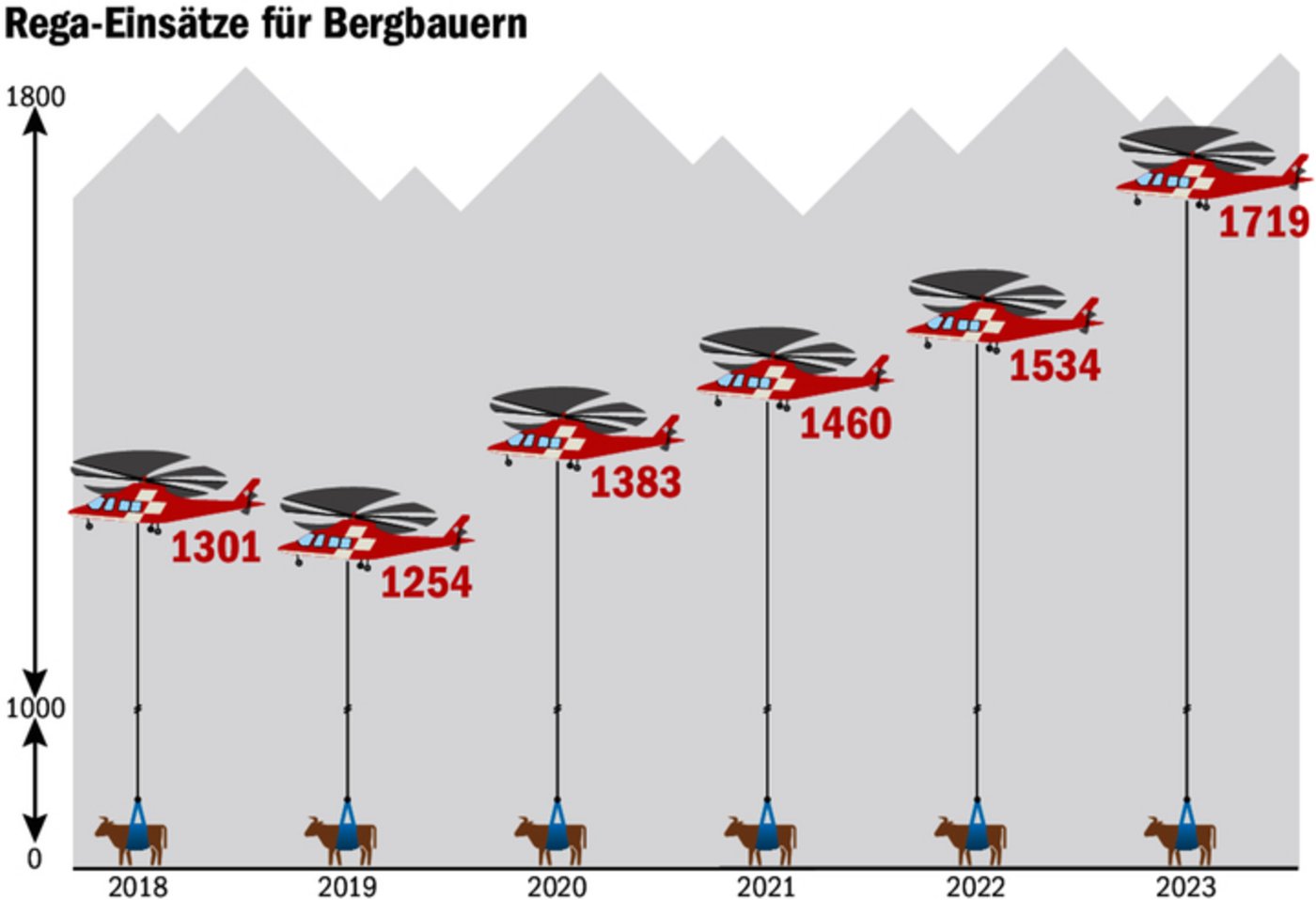 Jeden Alpsommer wird diese Dienstleistung zwischen 1200- bis rund 1700-mal nachgefragt. Erhoben wird die Anzahl der Transporte, die Anzahl Tiere kann ungleich höher sein. Für die sogenannten Contadino-Flüge beauftragt die Rega kommerzielle Helikopter-Transportunternehmen. Einen Teil führt sie selbst mit ihrem Trainingshelikopter H125 durch, der für die Ausbildung von Nachwuchspiloten genutzt wird. [REL 1]