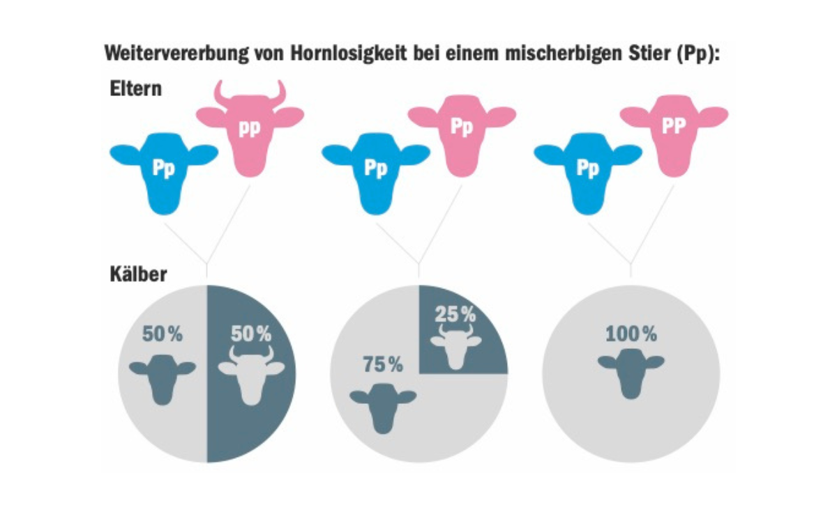 Bei der Zucht auf Hornlosigkeit wird unterschieden zwischen reinerbig hornlosen Tieren (PP) und mischerbig hornlosen Tieren (Pp). Die genetische Veranlagung setzt sich immer aus zwei Genen zusammen, einem vom Vatertier und einem vom Muttertier. Die Hornlosigkeit ist dominant, das heisst, ist ein einzelnes hornloses Gen vorhanden, setzt es sich durch. Die Kälber reinerbiger Stiere sind immer hornlos. Ist der Stier…