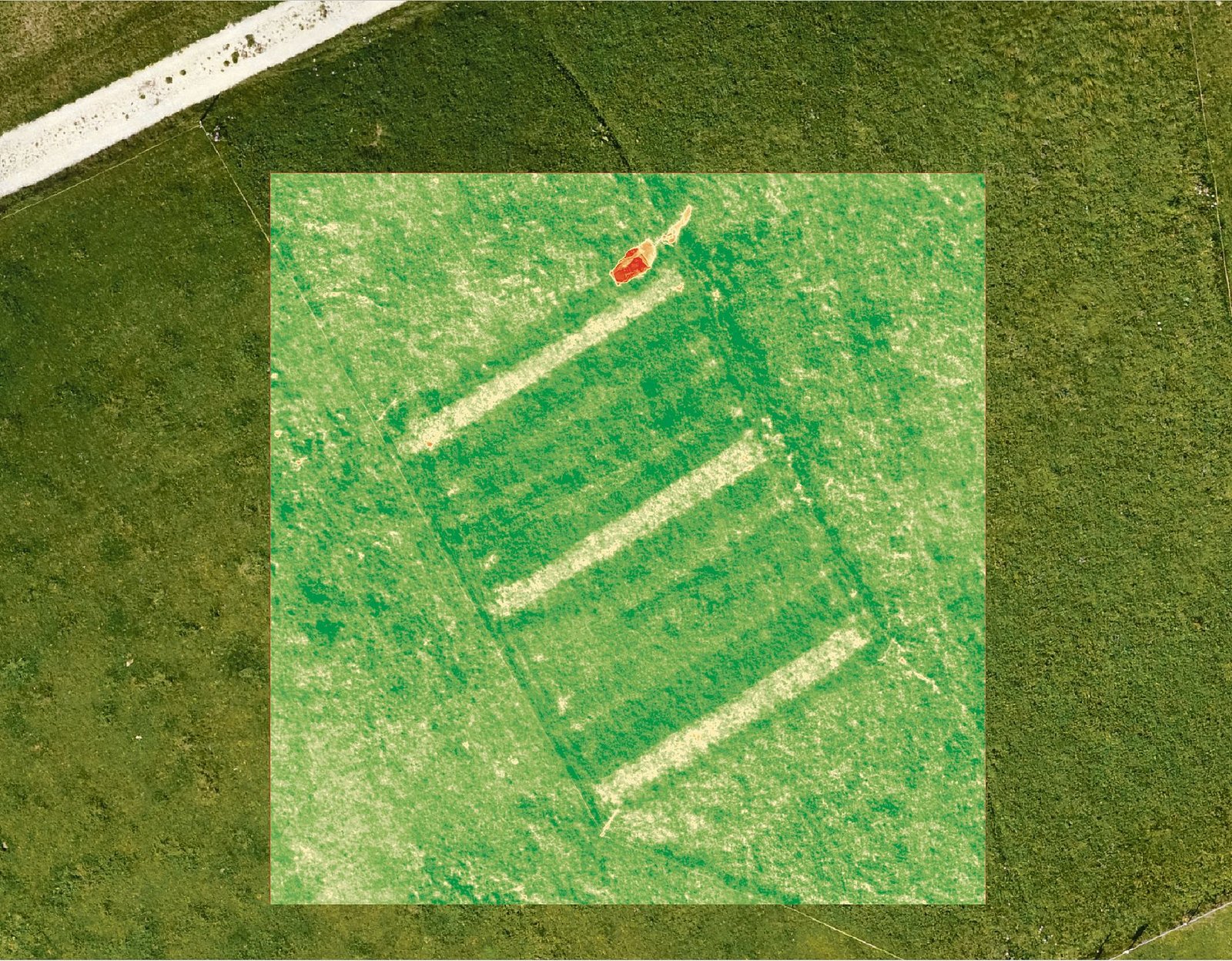 Die Drohne erlaubt es, gross-flächig Grashöhen zu erheben. Mithilfe der Grashöhe, den Bildern der aufgebauten Multispektralkamera und künstlicher Intelligenz kann die Drohne die Grasmenge der Gesamtfläche schätzen.