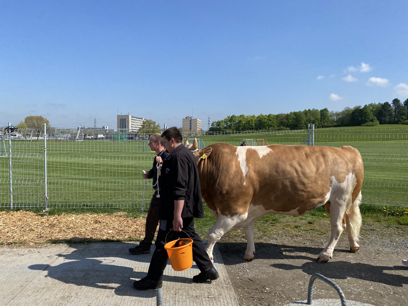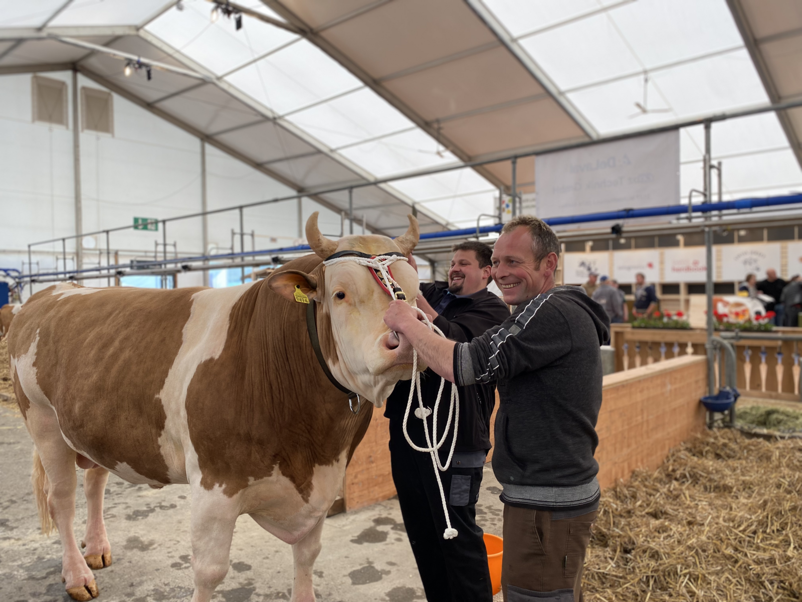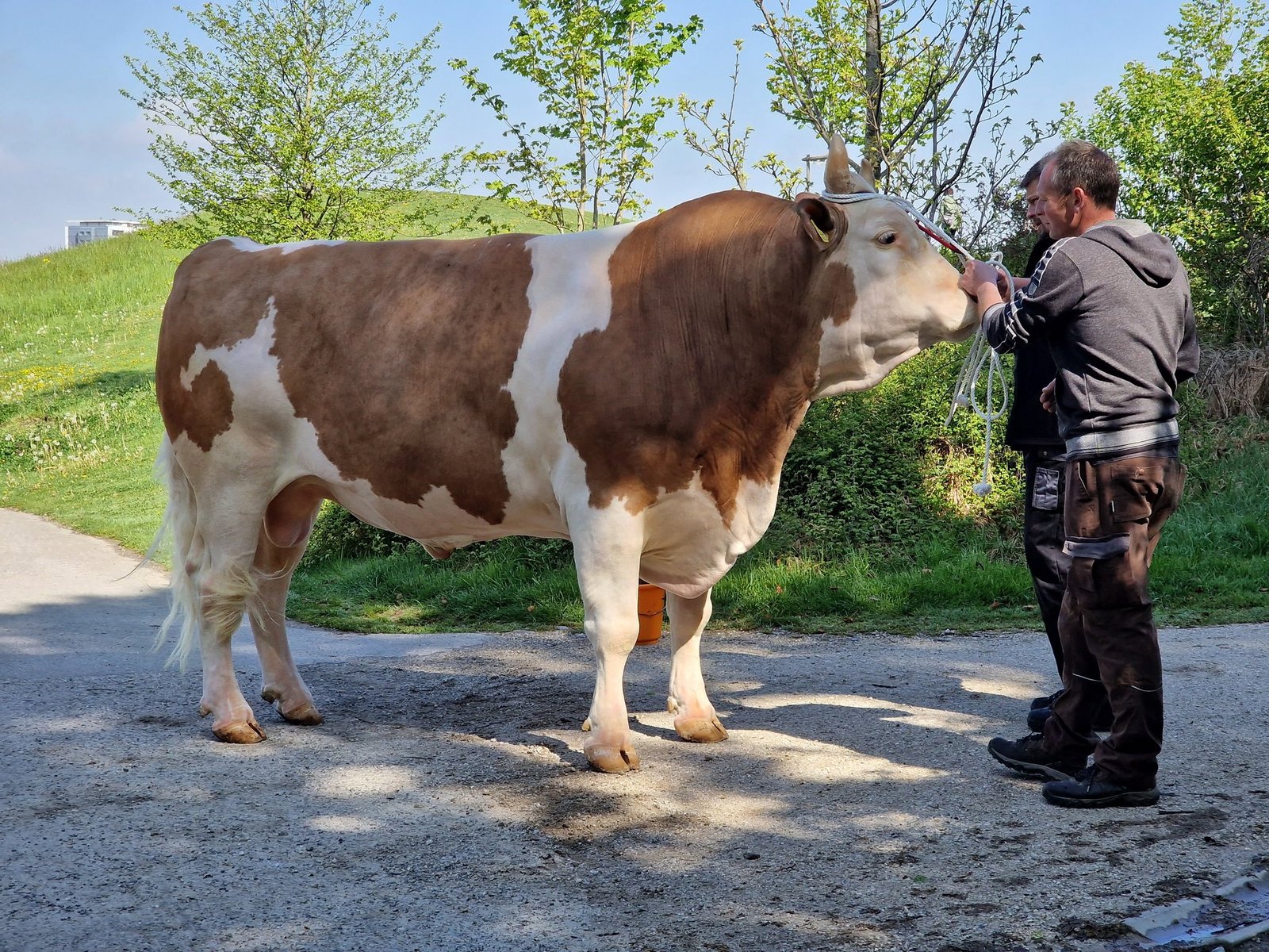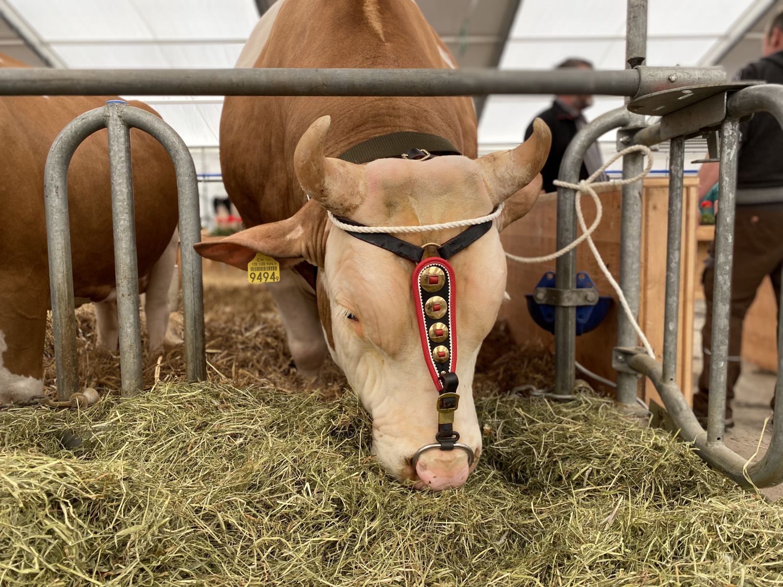 Neben den Kühen verschiedener Rassen sind auch immer zwei Stiere dabei. Heuer ist einer davon der stattliche Santos. Der prächtige Simmentalerstier ist kaum zu übersehen: Seine obere Linie liegt auf der Schulterhöhe seiner Besitzer; er überragt all die Kühe um ihn herum um ein gutes Stück. Der Muni bringt stolze 1260 kg auf die Waage, womit er wohl der schwerste Teilnehmer der BEA 2022 sein dürfte. Er zeigt sich heute von seiner besten Seite und blinzelt seelenruhig in den strahlend schönen Tag.