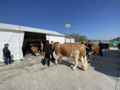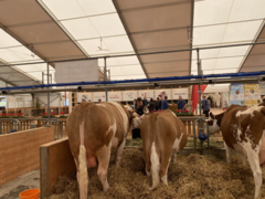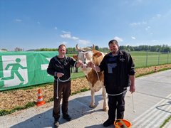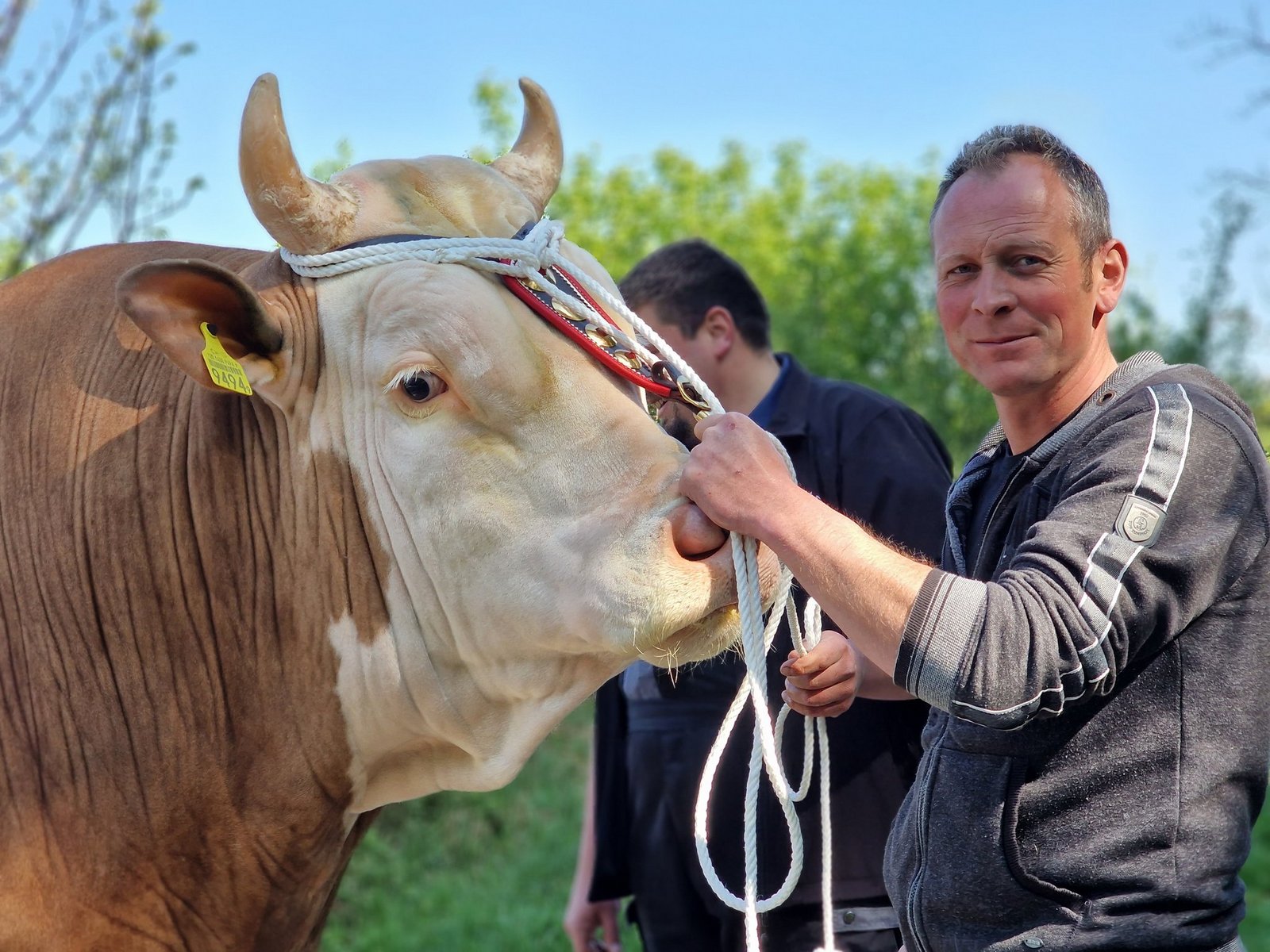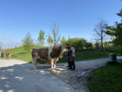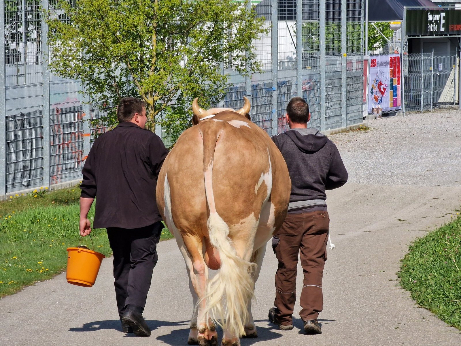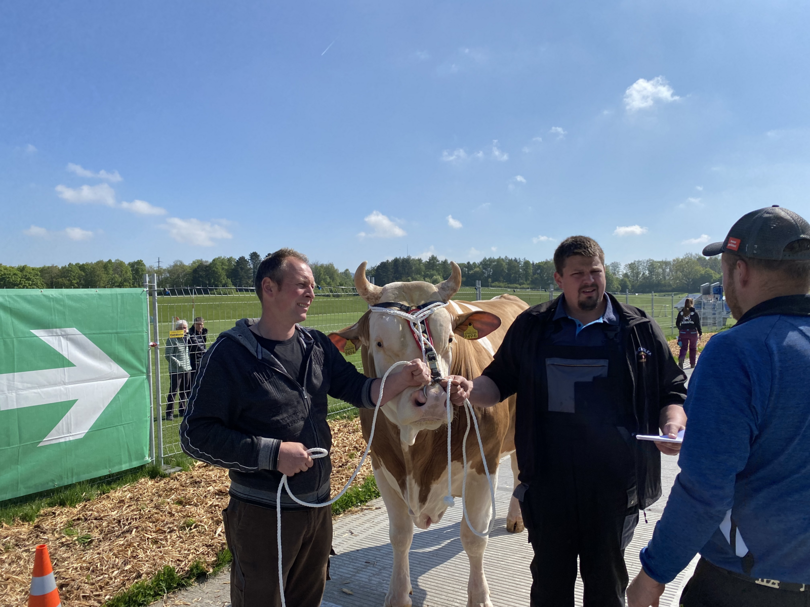 Neben den Kühen verschiedener Rassen sind auch immer zwei Stiere dabei. Heuer ist einer davon der stattliche Santos. Der prächtige Simmentalerstier ist kaum zu übersehen: Seine obere Linie liegt auf der Schulterhöhe seiner Besitzer; er überragt all die Kühe um ihn herum um ein gutes Stück. Der Muni bringt stolze 1260 kg auf die Waage, womit er wohl der schwerste Teilnehmer der BEA 2022 sein dürfte. Er zeigt sich heute von seiner besten Seite und blinzelt seelenruhig in den strahlend schönen Tag.