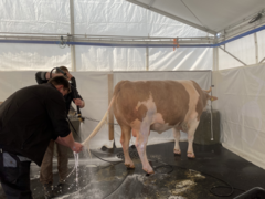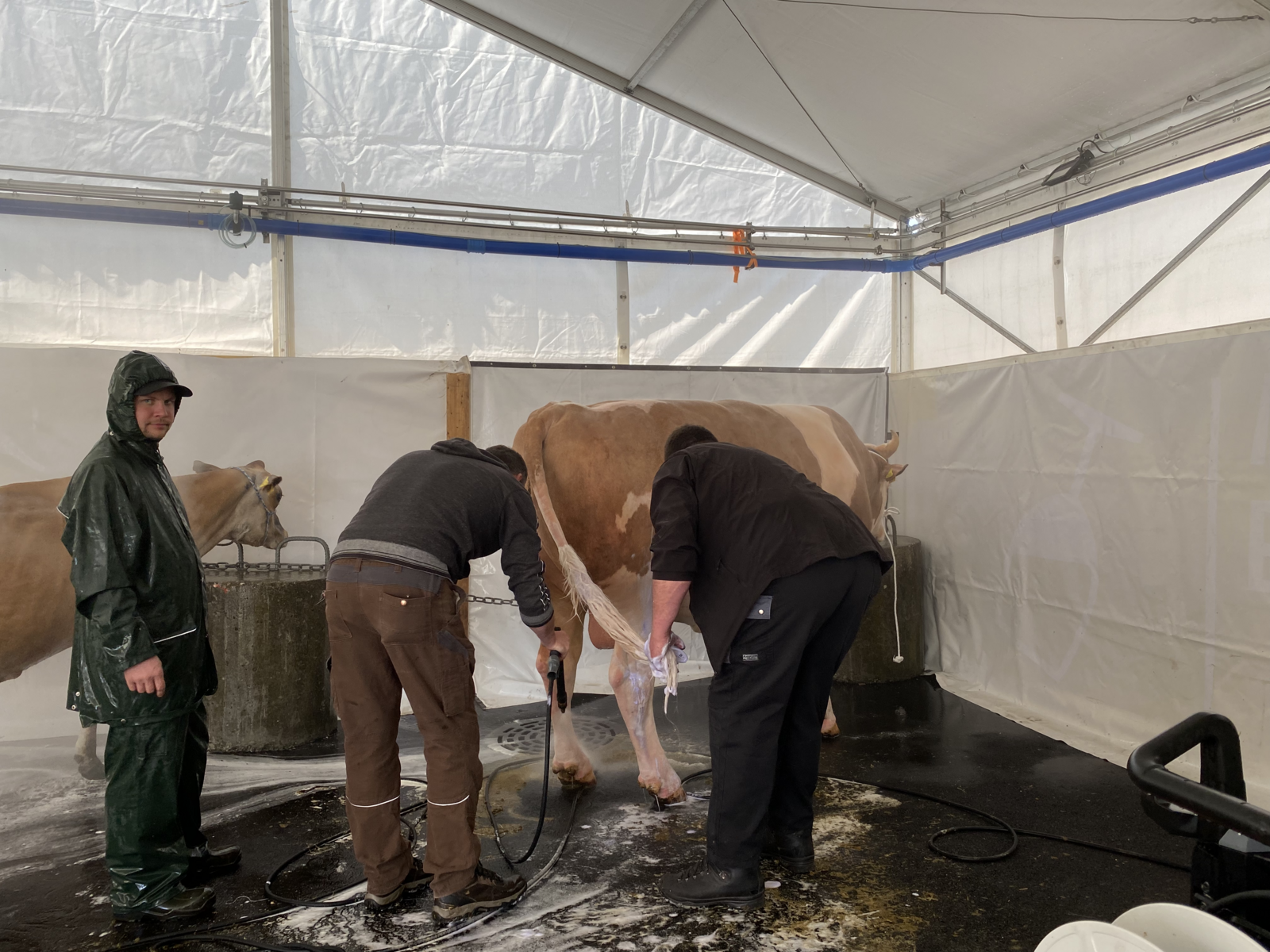 Bevor es in die Halle geht, wird der ohnehin schon blitzblanke Muni noch gründlich gewaschen. Beim Anstehen erzählen die beiden Besitzer Martin Liechti, Eggiwil BE und Bernhard Hadorn, Schangnau BE, wie der Stier zu ihnen kam.