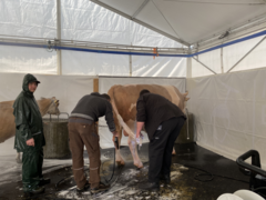 Nach dem Waschen betritt Santos die Halle und geht mit den beiden Emmentalern seelenruhig an seinen Platz. Er schnuppert an seiner neuen Nachbarin, einer Simmentalerkuh. Dann werden die Krippe und deren Inhalt überprüft. Nach einem kurzen Moment beginnt der Muni zu fressen – hier scheint es Santos zu gefallen.