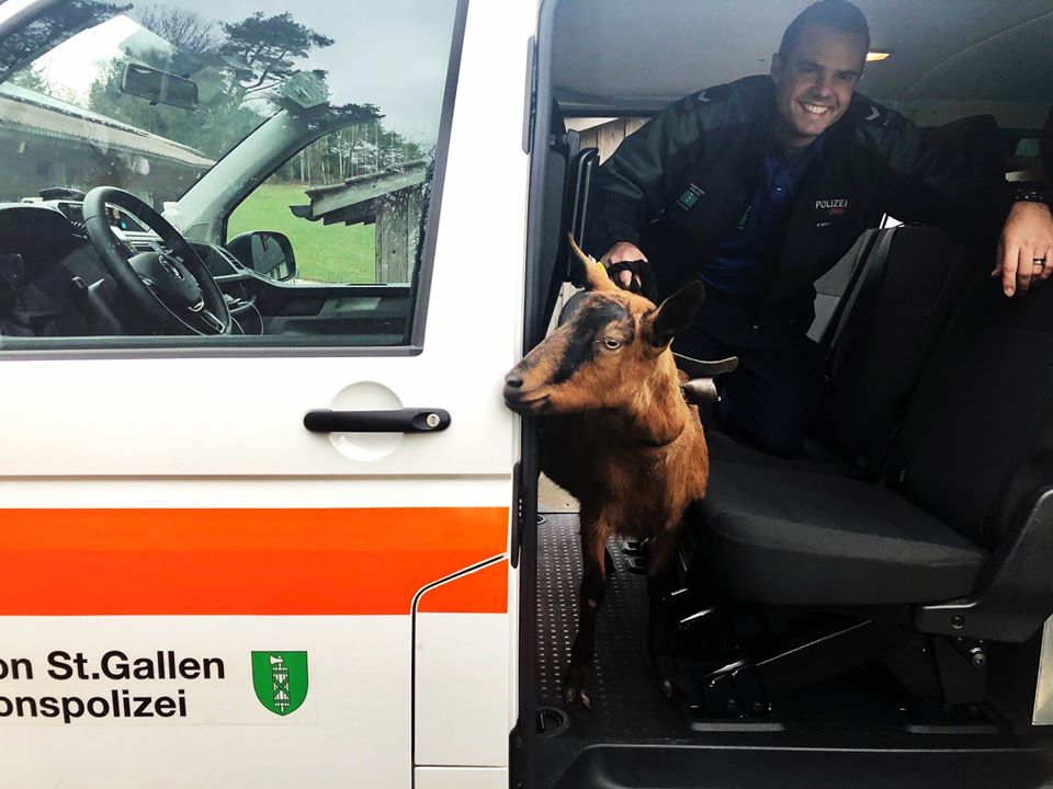 Zurück nach Hause chauffiert wurde die Ziege von St. Galler Kantonspolizisten. Dem Foto nach zu urteilen, hatten die auch ihren Spass an Nutellas Geschichte.