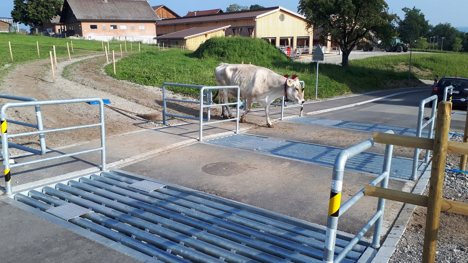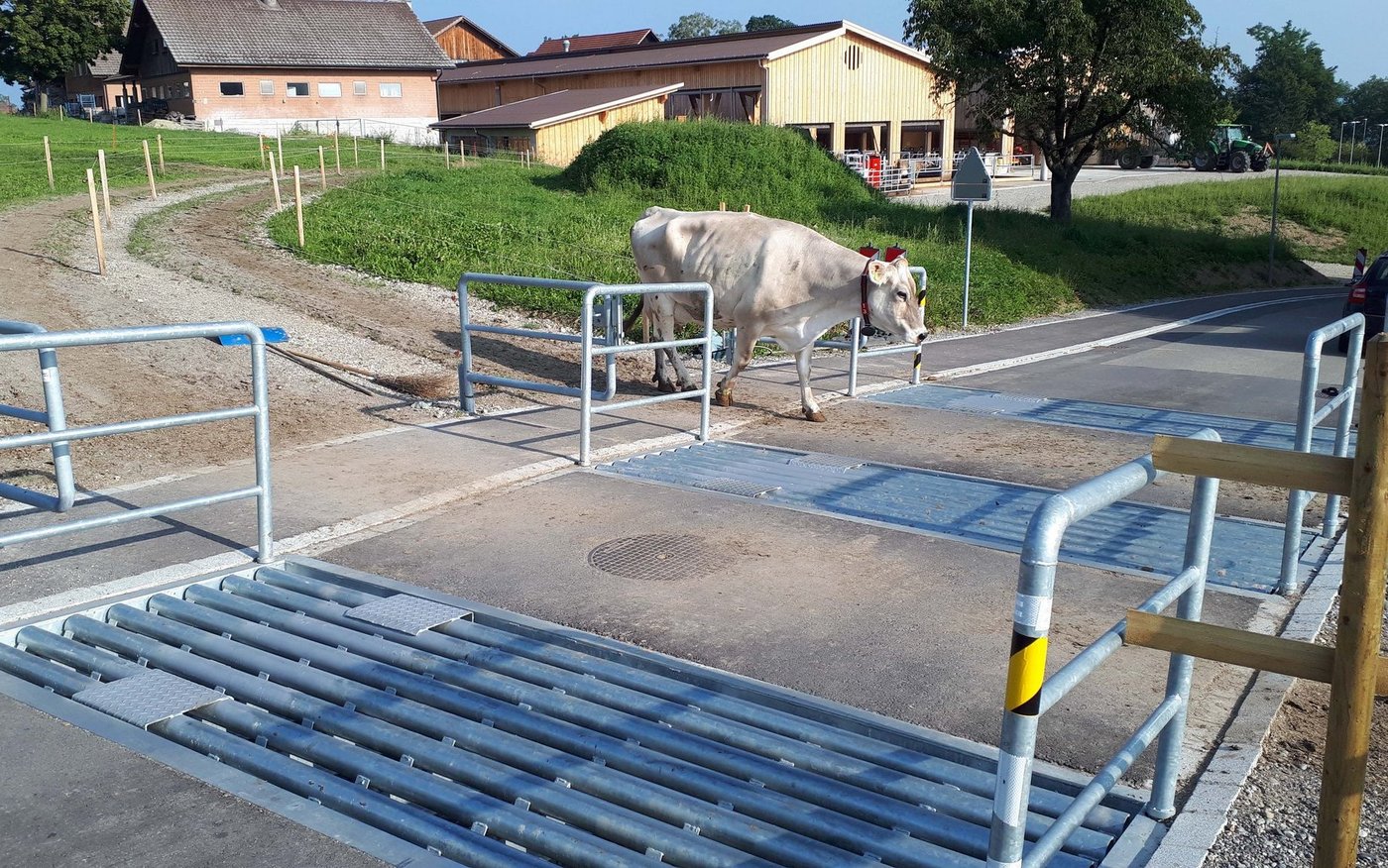 Während der Vegetationszeit sollen die Kühe möglichst viel weiden können. Das fördert das Wohlbefinden der Tiere und reduziert die Emissionen im Stall, verlangt aber einen freien Zugang zwischen der Weide, dem Melkroboter und dem Stall. Die Kühe müssen ungestört die angrenzende Strasse zu den Weideflächen passieren können. Dazu wurde in enger Zusammenarbeit mit der Gemeinde Salenstein ein frei zugänglicher Weideübergang mit in der Fahrbahn bündig eingelegten Rosten realisiert.