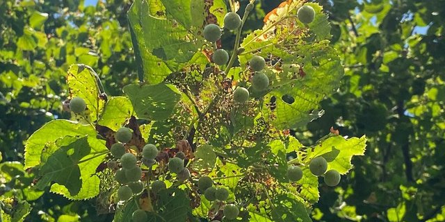 Ein Japankäfer frisst Löcher an einem Rebblatt heraus. Der Schädling ist etwa 1 cm gross und  kleiner als ein Mai- oder Junikäfer – also auf Pflanzen nicht einfach zu entdecken.