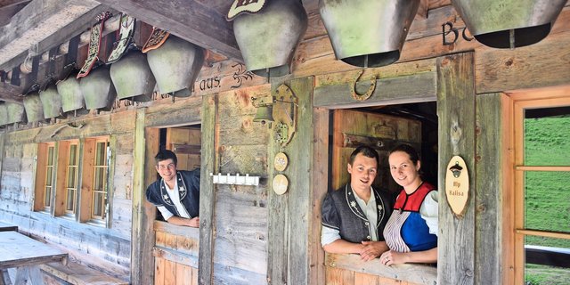 Die Alphütte der Familie Barras auf der Alp Groins du Milieu ist mit Glocken und Treicheln geschmückt.