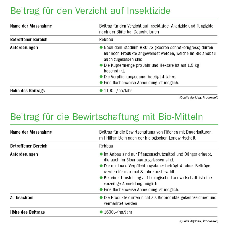 Als Ausgleich zur Senkung des Basisbeitrages können die Beiträge jedoch wichtig sein. Man sollte sich daher gut mit den notwendigen Anforderungen auseinandersetzen. Rebbaubetriebe haben die Möglichkeit, von fünf verschiedenen PSB zu profitieren. Vier Beiträge werden in den Tabellen vorgestellt.