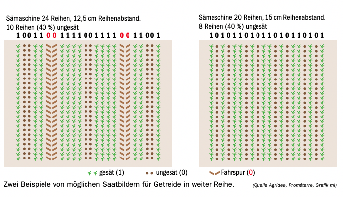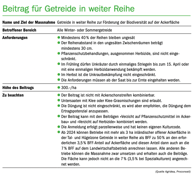 Der neue BFF-Typ soll Feldhasen, Feldlerchen sowie Ackerbegleitflora auf den Ackerflächen fördern. Auf derselben Fläche sollen aber auch Nahrungsmittel produziert werden können: Bei der Getreidesaat bleiben mindestens 40 % der Reihen ungesät. Die entstehenden Zwischenräume sollen Feldhasen oder bodenbrütenden Vögeln wie Lerchen bessere Fortpflanzungsbedingungen bieten. Deshalb sind auf diesem BFF-Typ die Unkrautbekämpfungsmöglichkeiten eingeschränkt. Im Frühling ist nur ein einmaliger Striegel- oder Herbizideinsatz erlaubt. Die Massnahme kann an die ab 2024 geforderten 3,5 % Acker-BFF angerechnet werden, es kann jedoch nur die Hälfte der 3,5 % mit Getreide in weiter Reihe erfüllt werden.