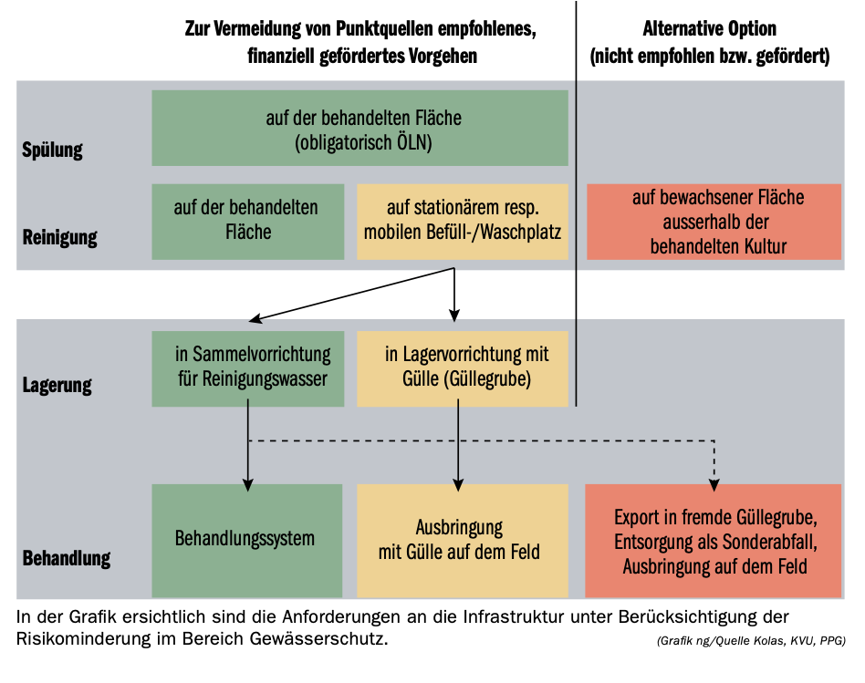 Bei Betrieben mit Tierhaltung können PSM-haltige Reinigungswasser in die Güllegrube eingeleitet werden und in Verbindung mit Hofdünger unkompliziert gelagert und mit dem Güllefass ausgebracht werden. Bei viehlosen Betrieben sind die Lösungen aufwendiger, dafür aber zahlreich: Einerseits können stillgelegte Hofdüngeranlagen unter gewissen Auflagen (Dichtheitsnachweis usw.) wieder in Betrieb genommen werden, andererseits gibt es doppelwandige unter- oder überirdische Rückhaltetanks als dedizierte Sammelbehälter für Spül- und Reinigungswasser.
