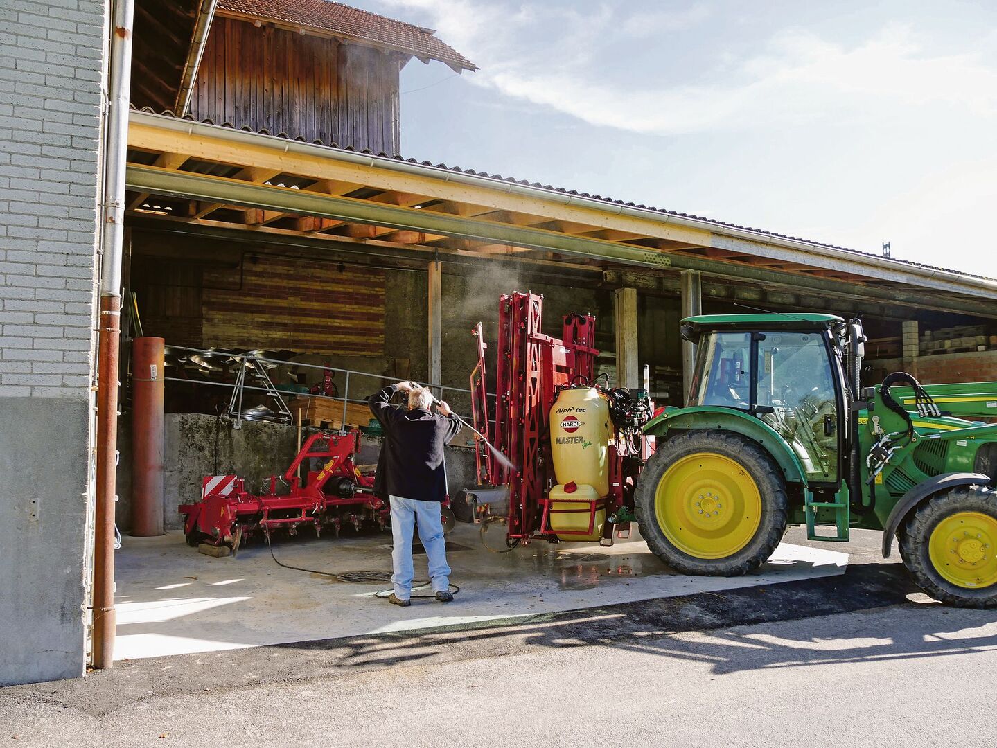 Die Innen- und Aussenreinigung des Spritzgeräts erfolgen wenn möglich direkt nach dem Ausbringen auf der behandelten Fläche. Hierzu gibt es für Spritzgeräte neben der ab 2023 für Spritzen mit einem Fassungsvermögen ab 400 Liter obligatorischen Innenreinigung auch Bausätze für eine aufgebaute Reinigungslanze zur Aussenreinigung. Erfolgt die Reinigung auf einem regelkonformen Waschplatz, stellt insbesondere die Handhabung von Niederschlagswasser eine Herausforderung dar.