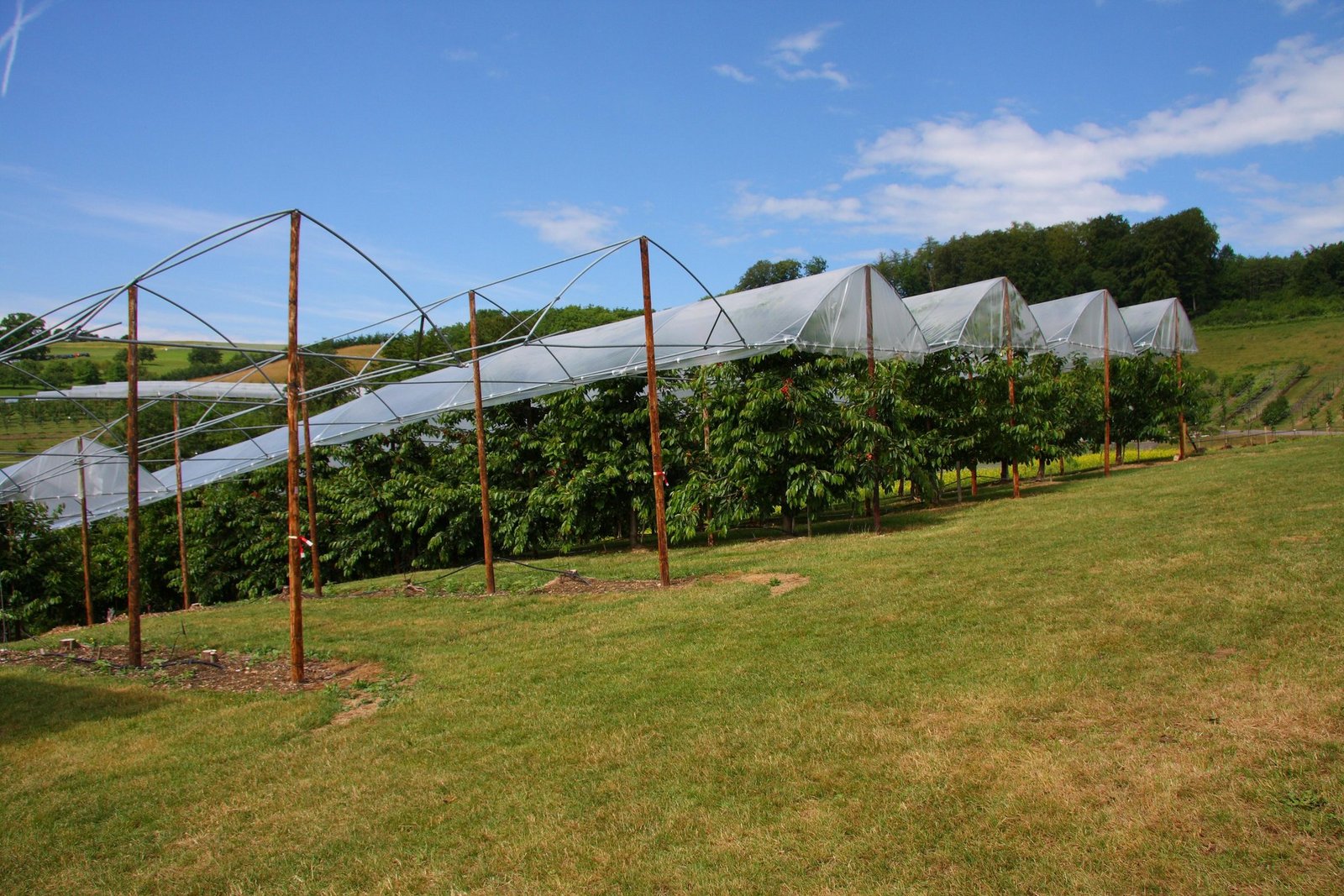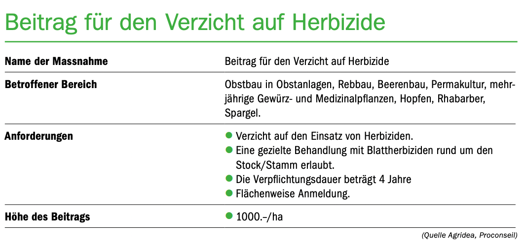 Parallel zu den Änderungen für die einjährigen Spezialkulturen und den Rebbau gibt es mit der neuen Agrarpolitik auch Anpassungen beim Obstbau. Diese Änderungen umfassen strengere Anforderungen an den ökologischen Leistungsnachweis sowie freiwillige Massnahmen. Eine dieser Neuerungen ist die Reduktion der Abdrift und Abschwemmung um mindestens einen Punkt. Die Reduktion der Abschwemmung muss auf allen Parzellen eingehalten werden, die mehr als 2 % Neigung aufweisen und in Richtung Gefälle an Oberflächengewässer und entwässerte Strassen oder Wege angrenzen. Dies wird durch die begrünten Fahrgassen und Vorgewende bereits erfüllt.