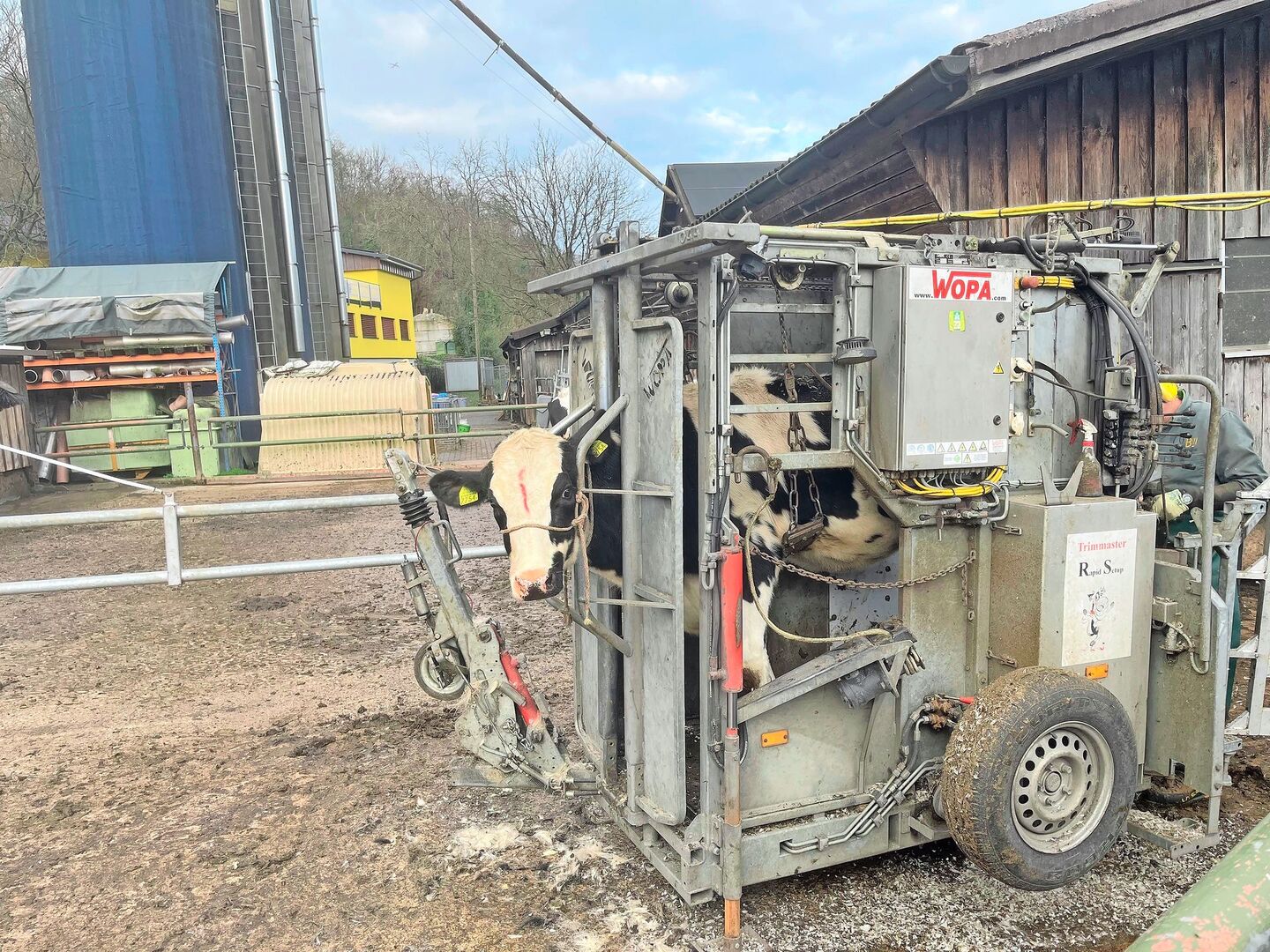 Als Präventionsmassnahme bekommen unsere Kühe und Rinder ab dem sechsten Lebensmonat zweimal im Jahr eine «Pediküre». Um dies möglichst effizient zu erledigen, kommt hierfür jeweils der Klauenschneider mit seinem Klauenstand vorbei.