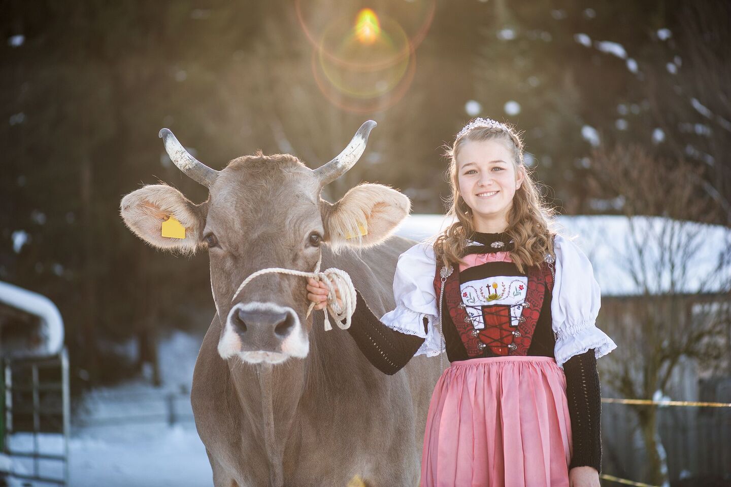 Wer die Braunviehkönigin Luzia Bieri daheim besuchen will, gelangt nur über kurvige, immer enger werdende und teilweise schneebedeckte Strassen ans Ziel. An der Tafel, auf der normalerweise die Leckereien des Hofladens angekündigt werden, prangt ein grosses Bild von Luzia im Dirndl. So wissen die Besucher(innen) gleich, dass sie hier bei der Braunviehkönigin richtig sind. Wir befinden uns in Rengg, am Under…