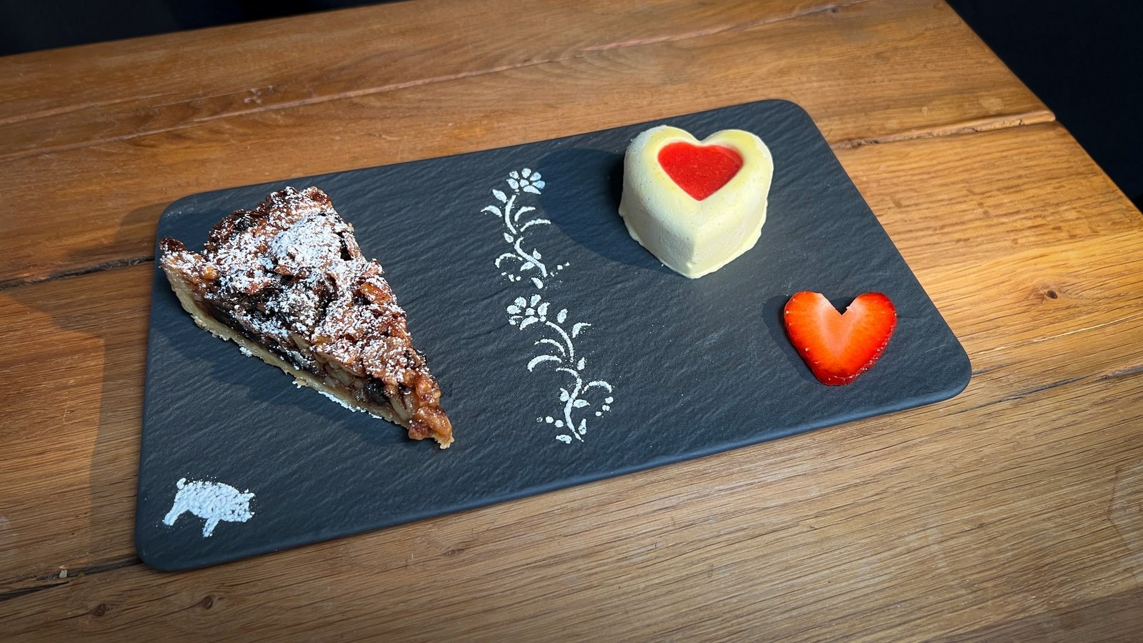 Baumnusstarte aus der Form nehmen und in Stücke schneiden. Auf jeden Dessertteller 1 Stück Baumnusstarte anrichten. Eine Kugel Vanille Parfait dazu dressieren.