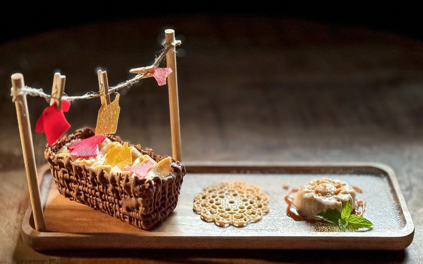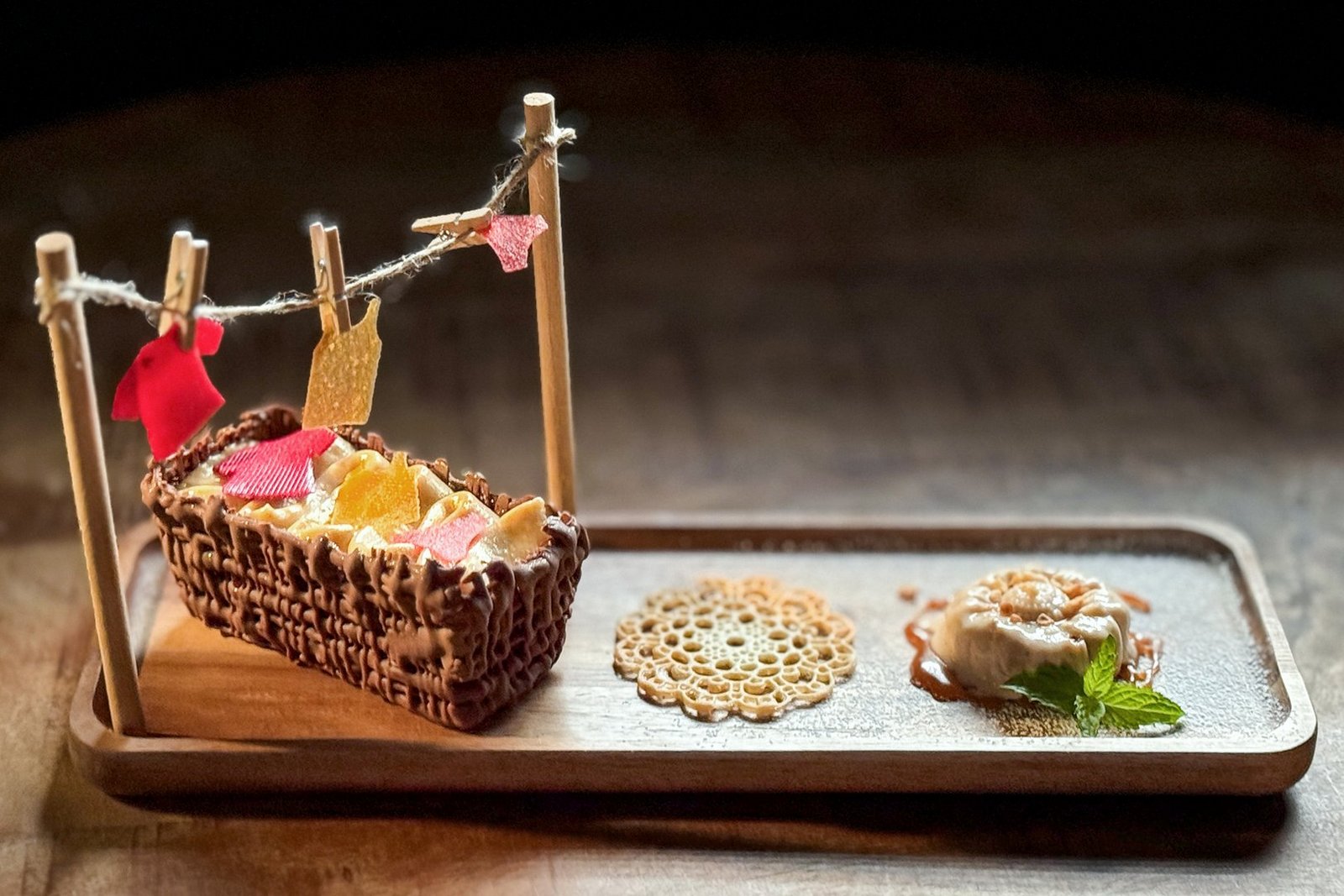Das Schokoladekörbchen auf eine Holzteller stellen. mit dem Bohrer rechts und links der einen Körbchen-Stirnseite je 1 Loch in das Holzbrett bohren. Mit dem Knusperboden befüllen. Biskuit, Zwetschgenpüree und Zimtcrème schichtweise einfüllen. Einige Fruchtlederkleidungsstücke auf das Wäschekörbchen legen. Die Vanille-Hüppe mittig anrichten. Neben der Hüppe einen Karamelspiegel formen. Das Baumnussglacé-Blümchen darauf anrichten. Mit Pfefferminze und klein gehackten Baumnusstückli bestreuen. Je ein Holzspiesschen in die Bohrerlöcher stecken. Eine Schnur als Wächeleine an den Holzspiessen befestigen. Fruchtlederkleidungsstücke mit Wächeklämmerli aufhängen.