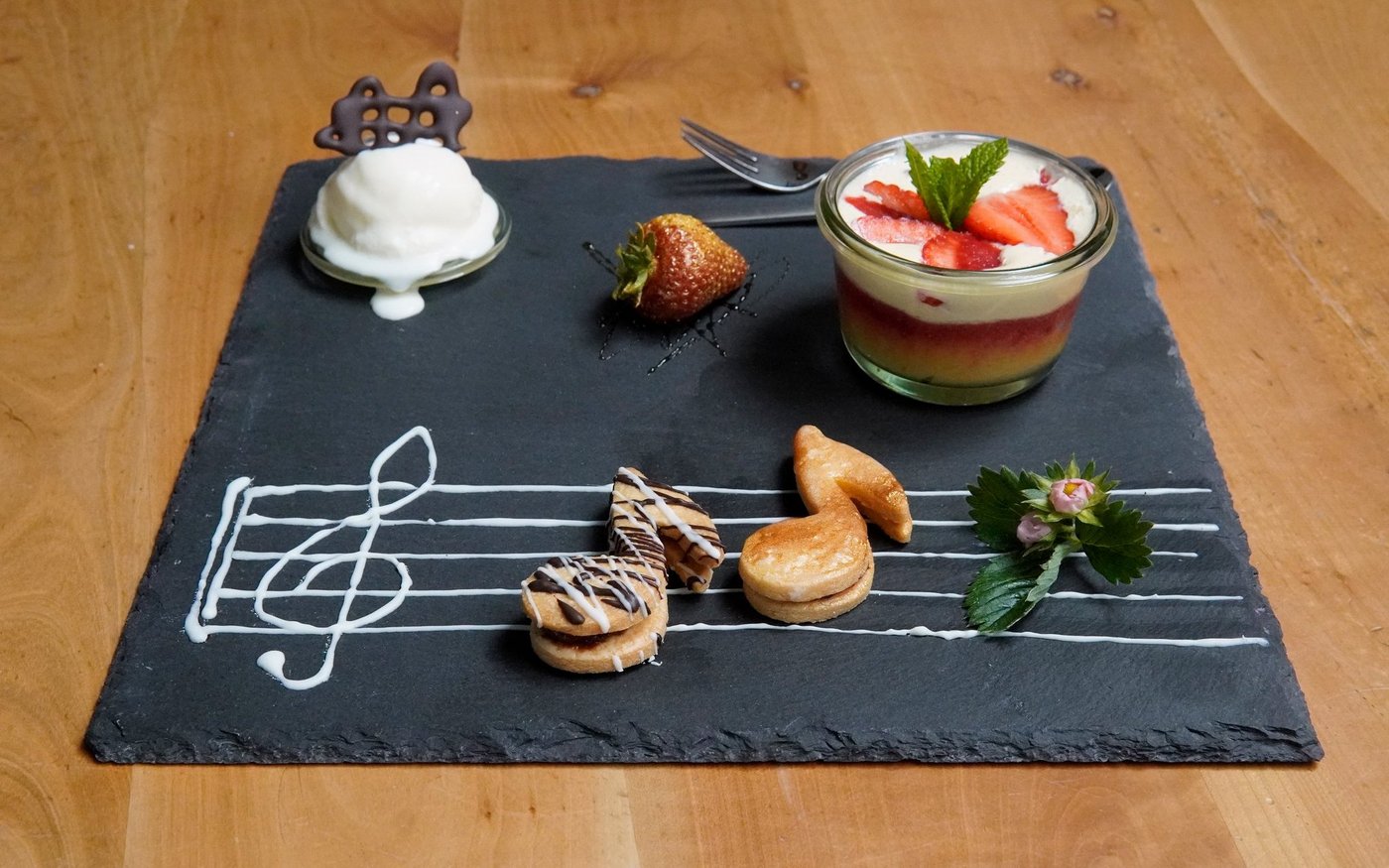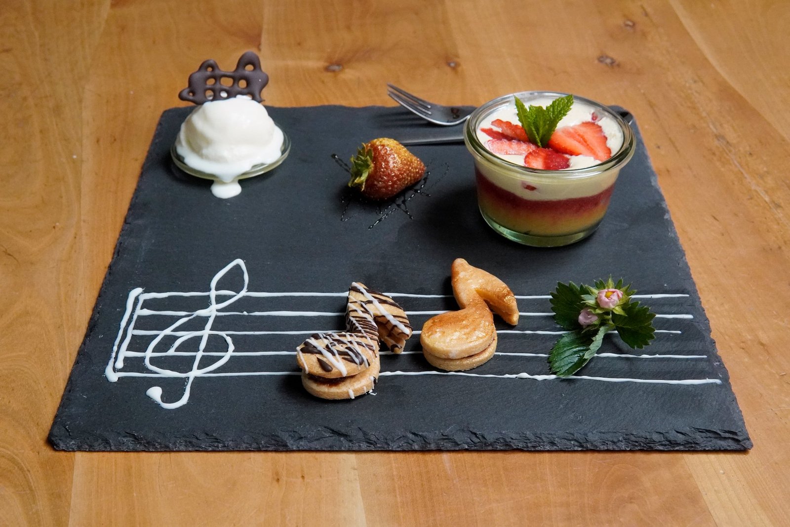 Erdbeertiramisu auf Dessertteller anrichten. Mit Erdbeeren und Minzeblättchen garnieren. Eine Kugel Sauerrahmglace und eine gefüllte Musiknote dazu anrichten.