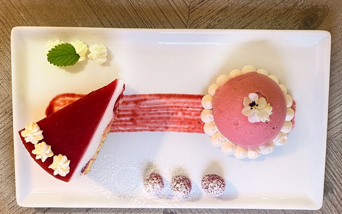 Je ein Stück Torte auf einen Dessertteller anrichten. Meringue daneben platzieren. Je eine Kugel Himbeerglace auf der Meringue anrichten. Den Teller mit den Himbeeren und Minzblättern ausgarnieren.