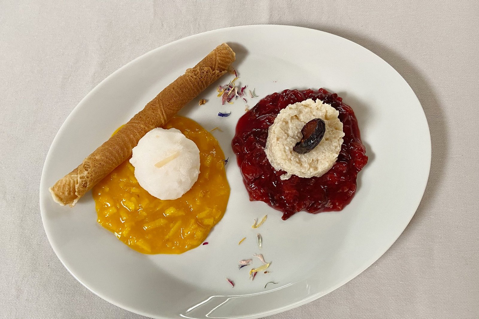 Ingwer-Verjus Sorbet auf Kürbispüree Ingwer-Verjus Sorbet 1,6dl Verjus 1,1dl Wasser 70g Zucker 0,3dl Apfelsaft 20g frischen Ingwer, in feine Scheiben geschnitten 0,3dl Wasser 25g Zucker 20g frischen Ingwer, in sehr feine Würfeli geschnitten 2 Eiweiss, steif geschlagen 1 halbe Scheibe eingelegter Ingwer, in Streifen geschnitten (Zubereitung siehe Rezepte Vorspeise) Information: Verjus ist der Saft…