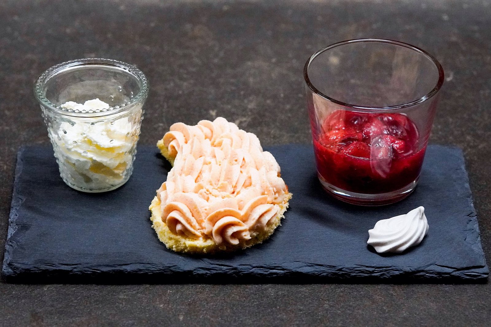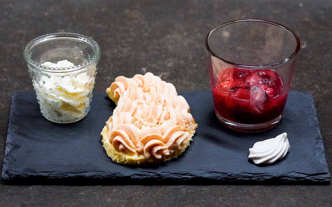 Je einen Biskuittropfen auf Dessertteller legen. Die Magenträs-Moussemasse mit dem Spritzsack aufspritzen. Zwetschgenkompott zum Magenträs-Tropfen stellen. Schlagrahm mit dem Spritzsack in einem kleinen Dessertglas anrichten und ebenfalls dazu stellen. 1 Meringue dazu legen.