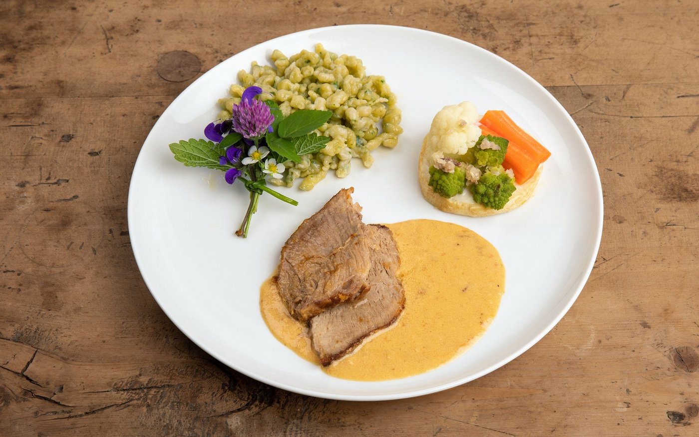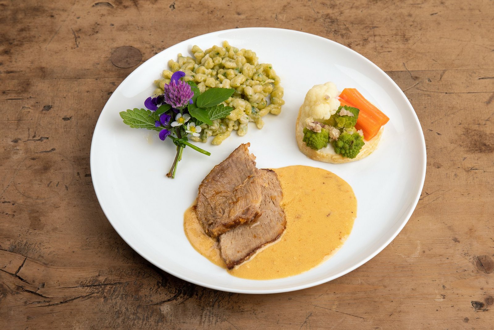 Rahmbraten mit einem scharfen Messer in feine Tranchen schneiden. Auf vorgewärmten Tellern einen Saucenspiegel bilden und je zwei Tranchen Braten darauf anrichten. Gemüsebouquet und Bergkräuter-Knöpfli dazu anrichten. Mit einem Kräuter-Blüten-Bouquet ausgarnieren.