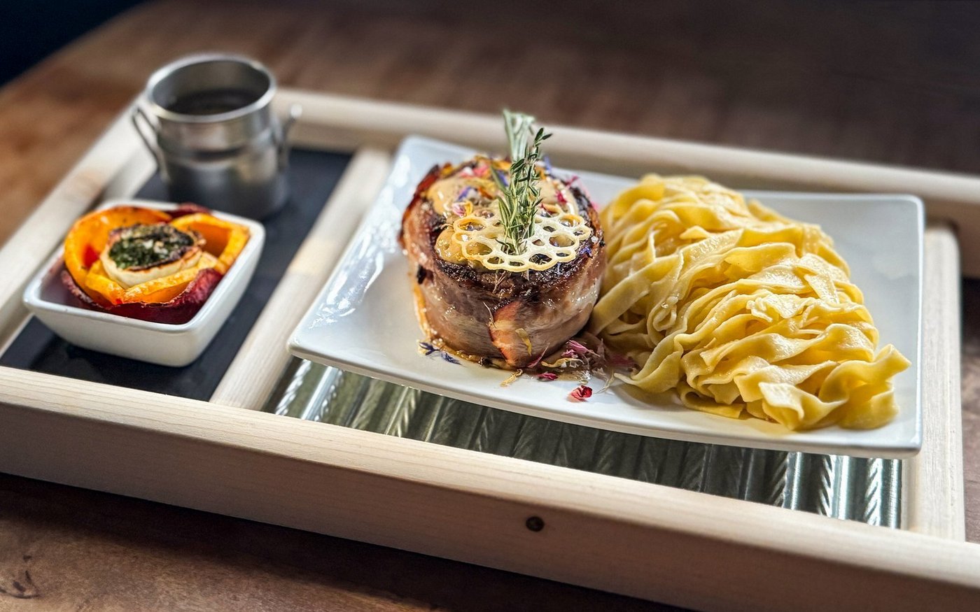 Mit der Senf-Rahm-Knoblauch-Sauce auf vorgewärmte Teller einen Spiegel bilden. Ein Filet-Medaillon daraufsetzen, mit wenig Senf-Rahm-Knoblauch-Sauce beträufeln. Gruyèrehüppe aufs Filet-Medaillon legen und mit einem Rosmarinzweiglein garnieren. Nudeln/Tagliatelle auf einer Gabel aufrollen und neben das Fleisch setzen. Mit Blütensalz bestreuen. Förmchen mit Gemüseröschen und Senf-Rahm-Knoblauch-Sauce dazu stellen.