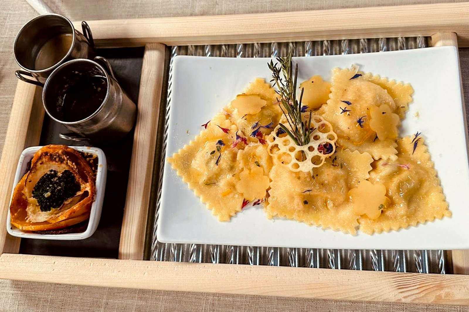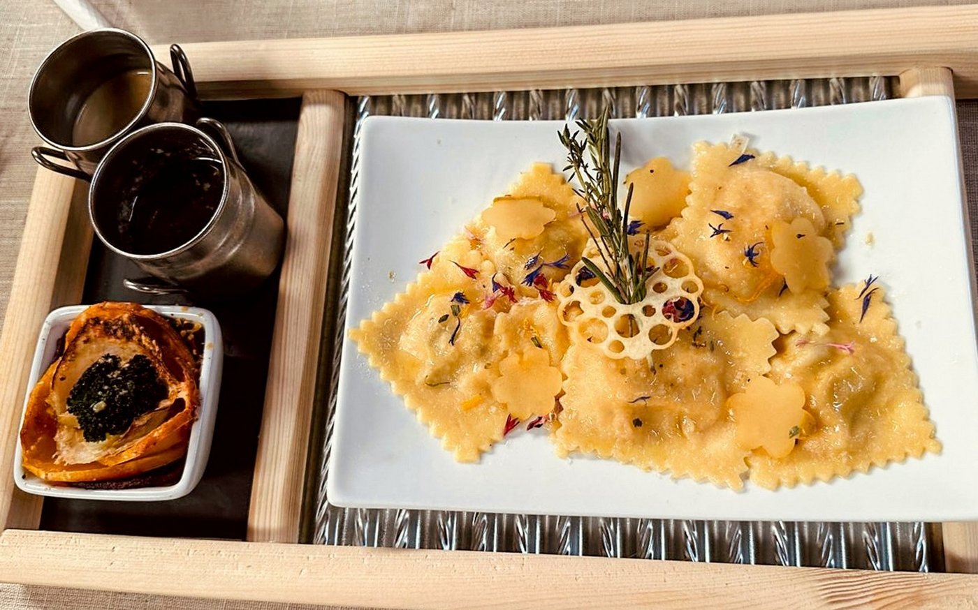 Vegetarische Alternative: Ravioli-Duett von der Birne und dem Kürbis, Gemüserösli, Beurre Noisette