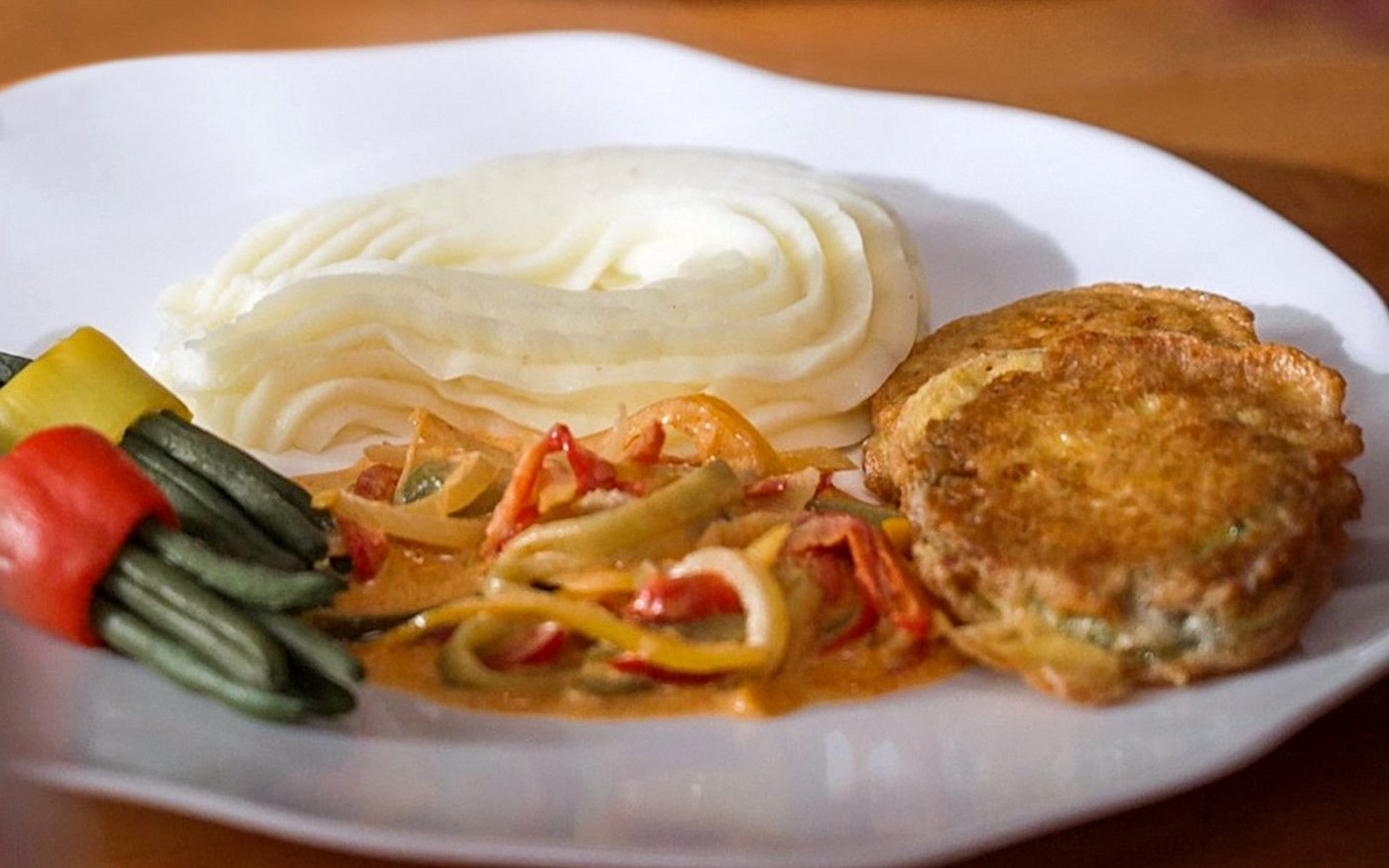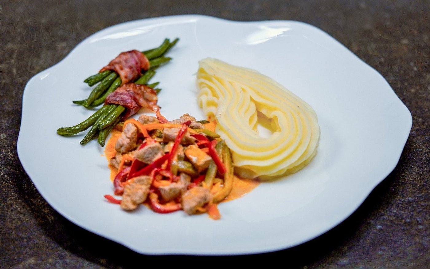 Das Kalbfleisch-Stroganoff auf vorgewärmte Teller anrichten. Den Kartoffelstock in einen Spritzsack füllen und neben dem Stroganoff einen Tropfen bilden. Bohnenpäckli dazu anrichten.