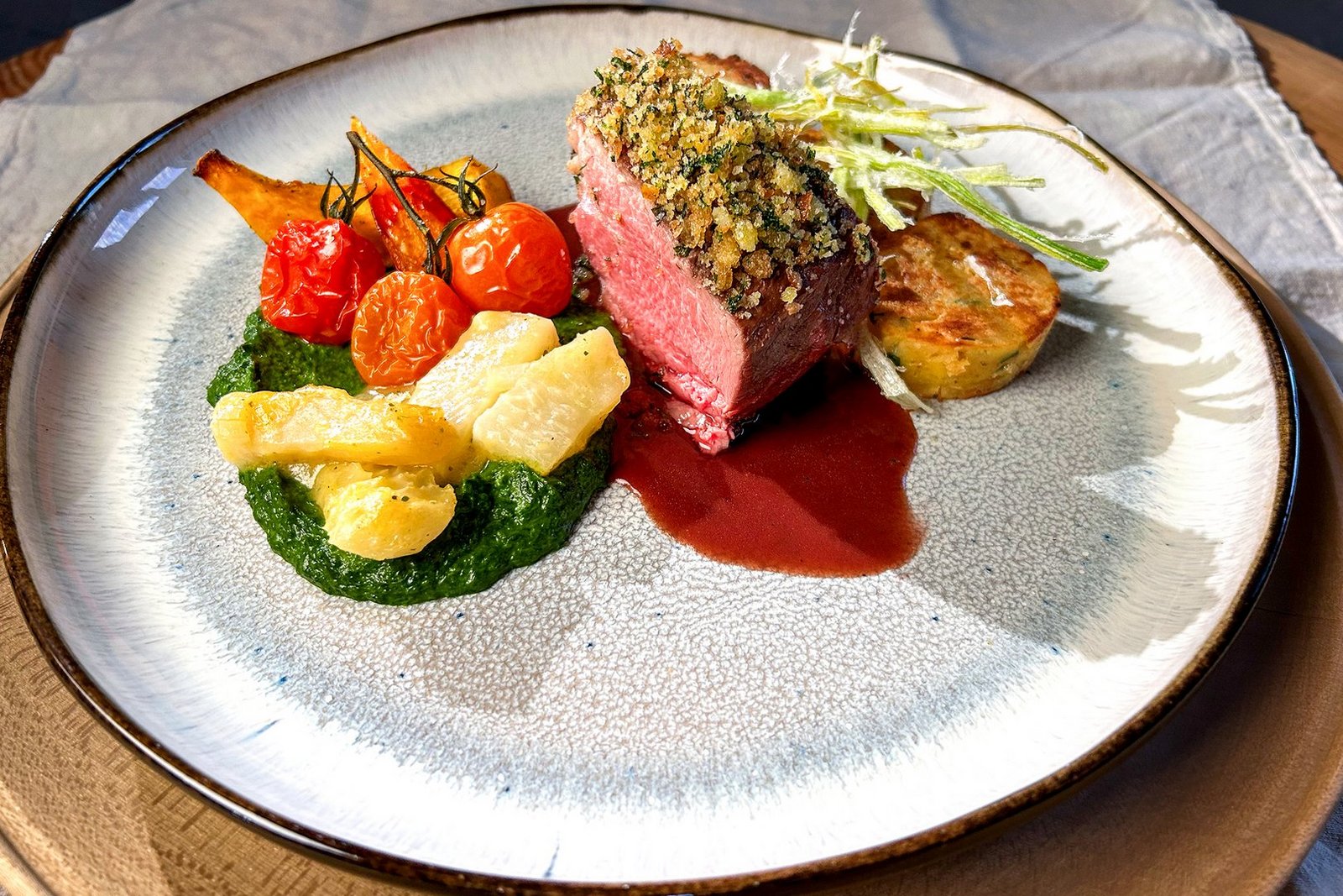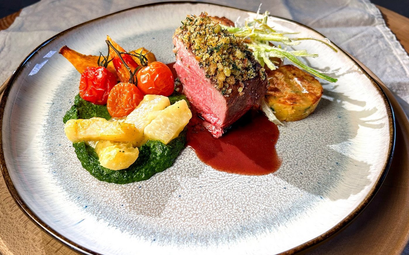 Auf vorgewärmten Tellern in der Mitte mit der Rotweinsauce einen Saucenspiegel bilden. Das Rindsfilet mit einem scharfen Messer in Tranchen schneiden. Rindfleischtranche in den Saucenspiegel legen. Mit einem Löffel mit dem Petersilienpüree neben dem Rindsfilet einen Spiegel bilden. 3-4 Kohlrabistreifen, ein paar Cherrytomaten und 1-2 Kürbisschnitze darauf anrichten. 2-3 Serviettenknödel auf die andere Seite des Rindfleischfilets geben und mit dem Lauchstroh garnieren.