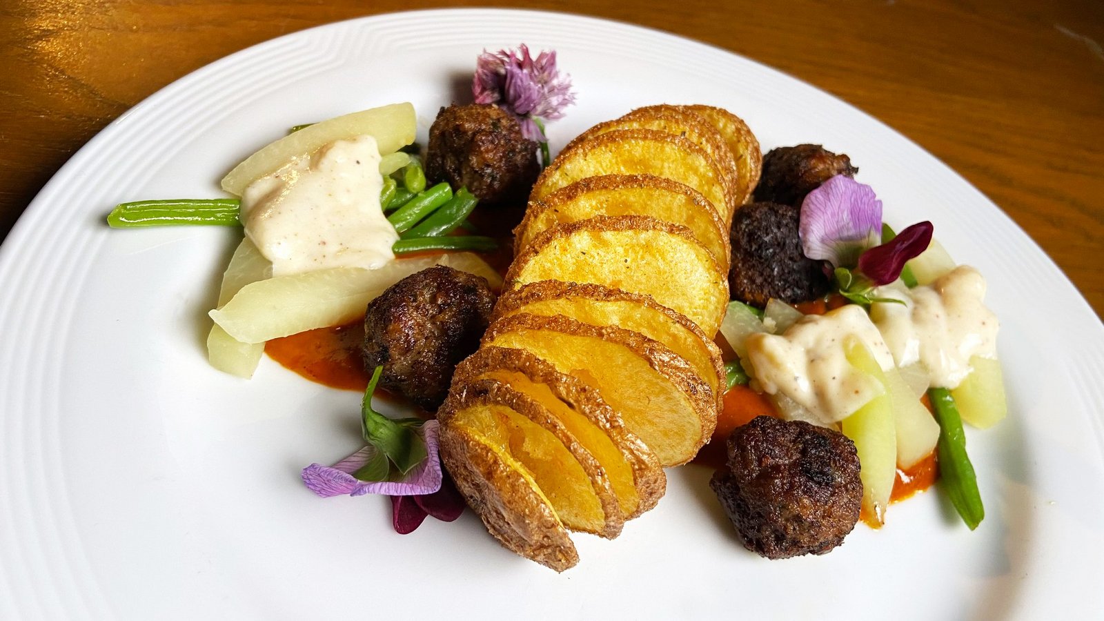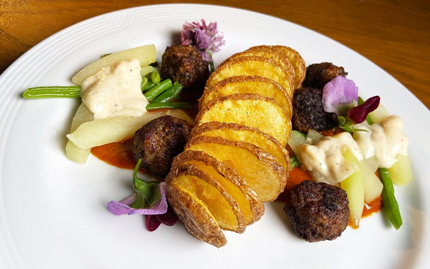 Auf vorgewärmten Tellern mit der Paprikasauce einen Saucenspiegel bilden. 5 Hacktätschli darauf anrichten. Kohlrabi und Bohnen dazu anrichten. Kohlrabi mit weisser Sauce begiessen. Spiralkartoffel dazu legen. Teller mit Küchenkräutern ausgarnieren.