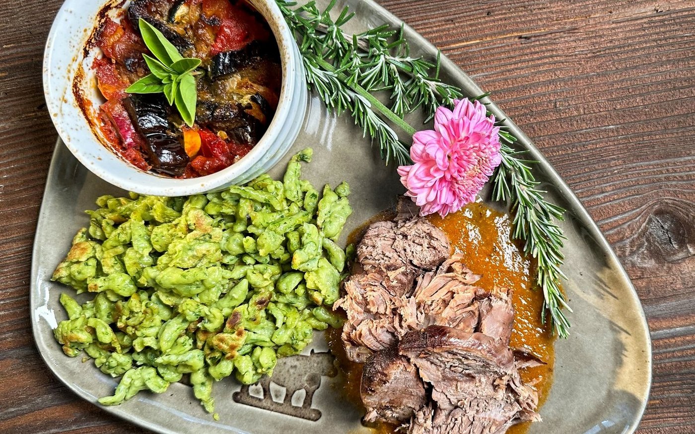 Den Kalbsschulterbraten mit einem scharfen Messer in Tranchen schneiden. Auf vorgewärmten Tellern mit der Sauce einen Saucenspiegel bilden. Je eine Tranche Kalbsschulterbraten darin anrichten. Portionenförmchen mit dem Ratatouille daneben platzieren. Kräuterknöpfli dazu anrichten. Mit frischen Kräutern und essbaren Blumen dekorieren.
