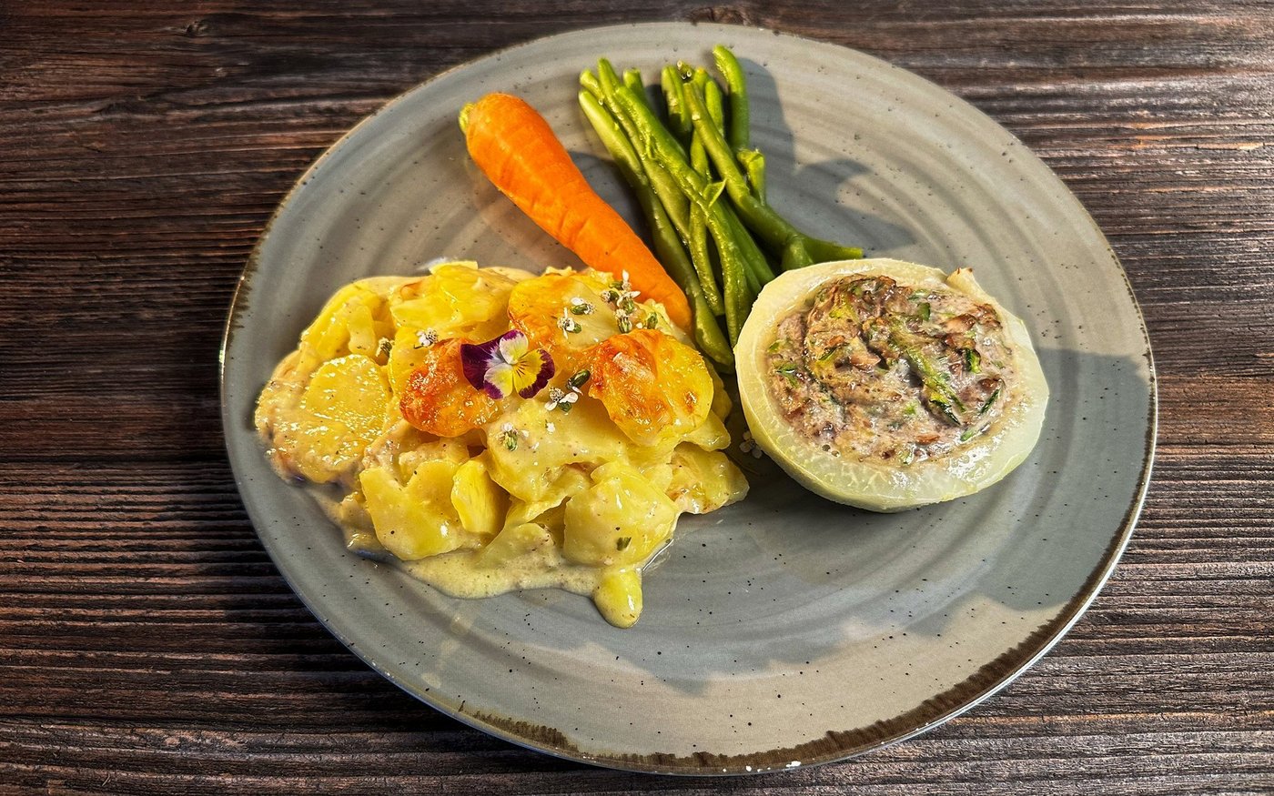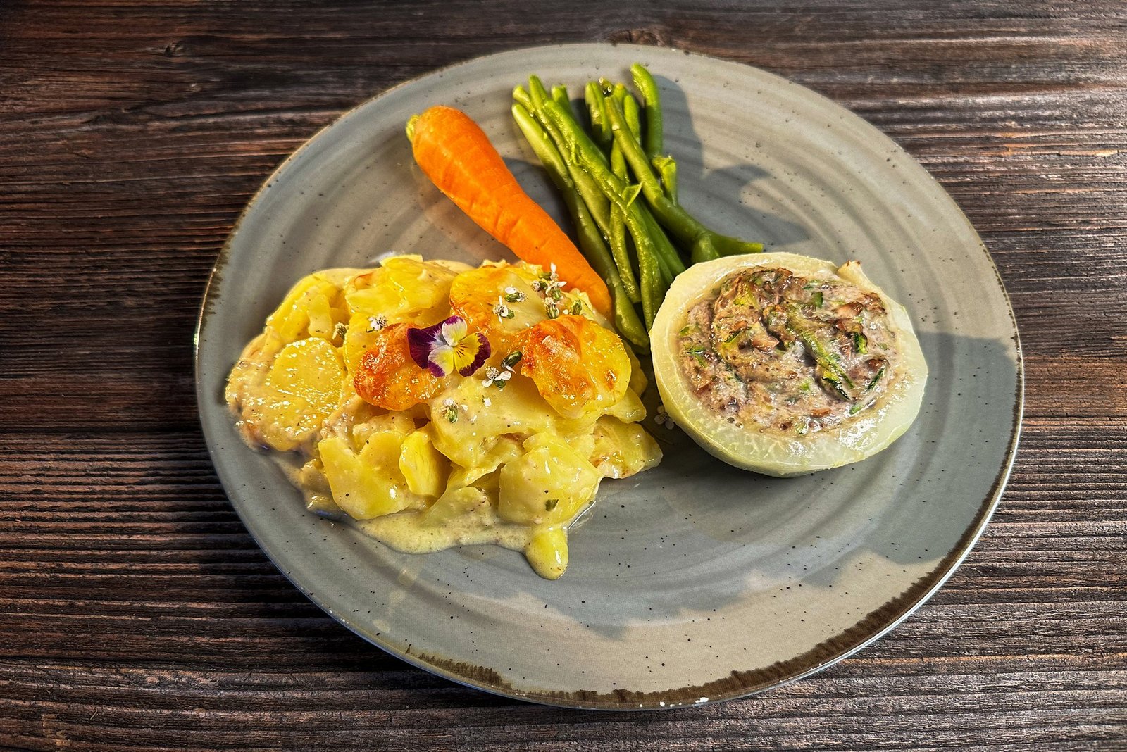 Gefüllte Kohlrabi 1 Kohlrabi 1dl Wasser Füllung (vom Kalbskotelette) [REL 1] Kohlrabi schälen und halbieren, aushöhlen und in eine Pfanne geben. Wasser zugeben, aufkochen und bei mittlerer Temperatur köcheln lassen, bis sie knapp gar sind. Aus dem Wasser ziehen und abtropfen lassen. Mit der Füllung (siehe Rezept der Hauptspeise) füllen. Tipp: wer über einen Dampfgarer verfügt, kann die Kohlrabi im…
